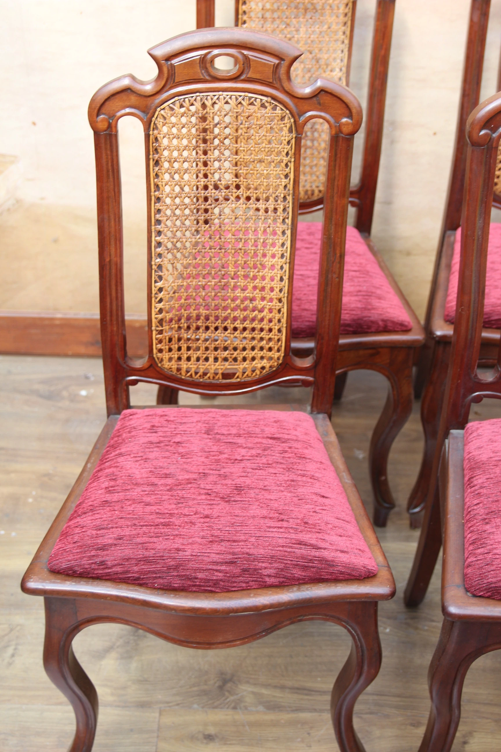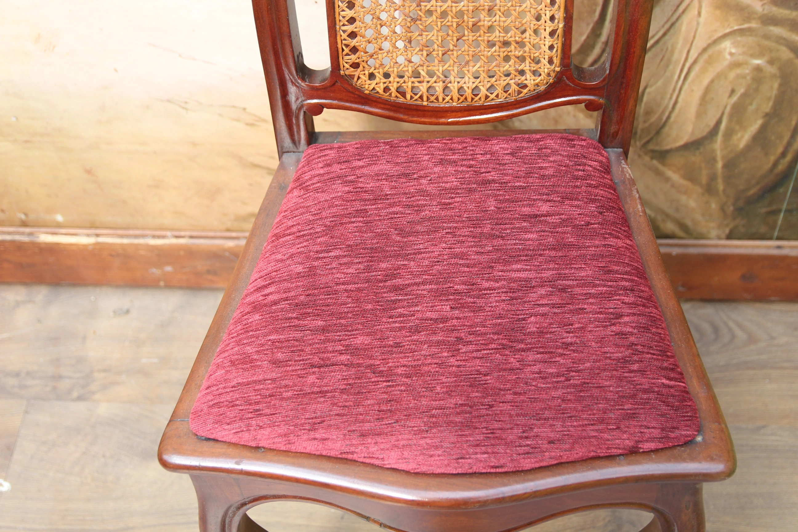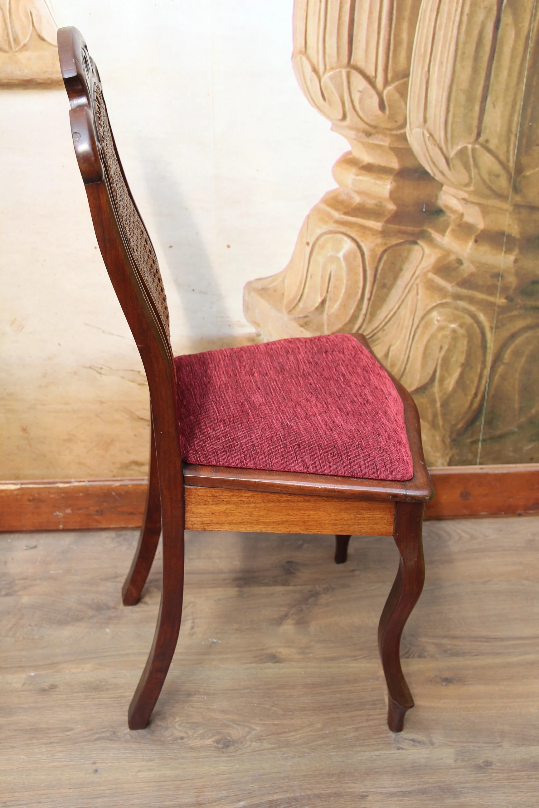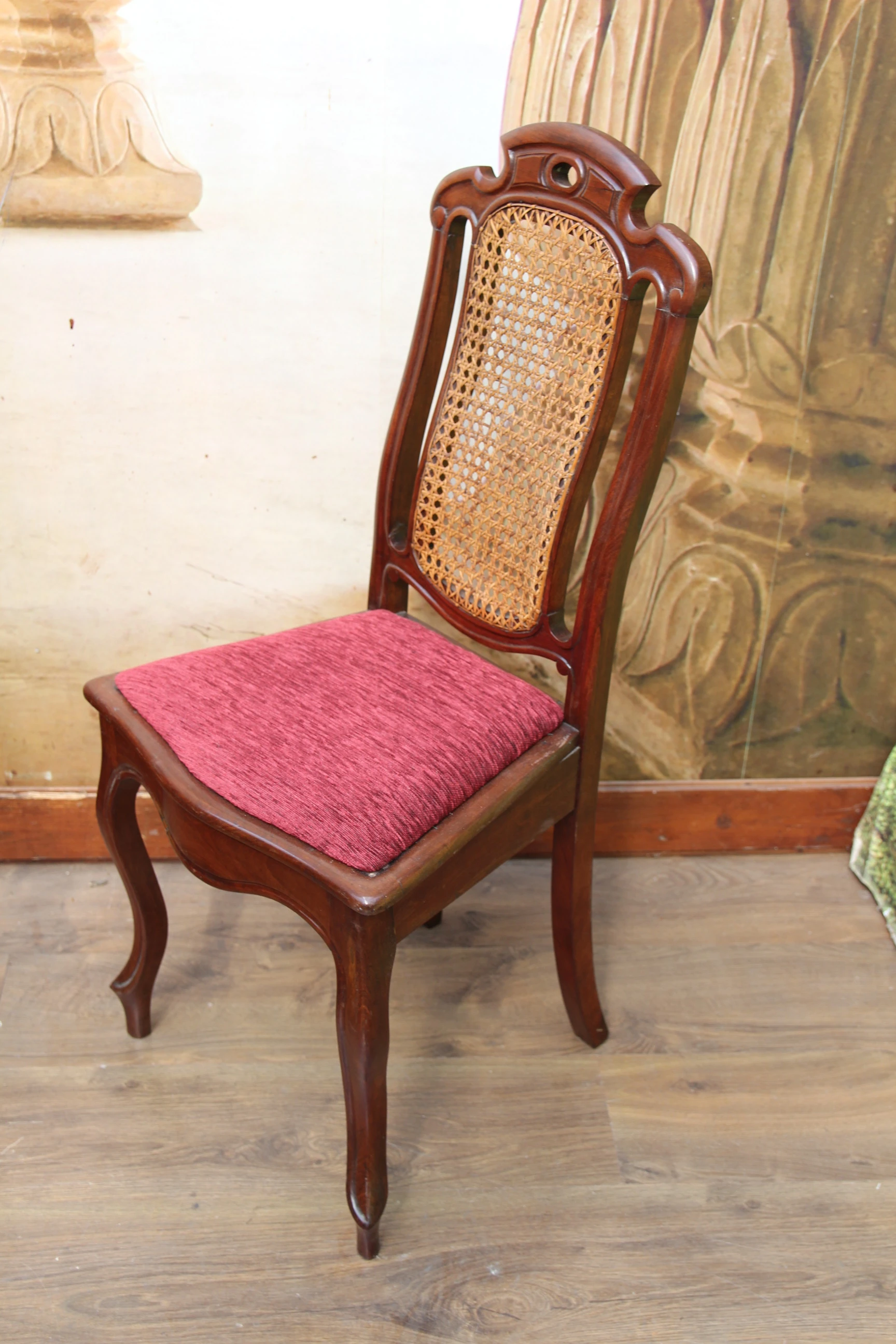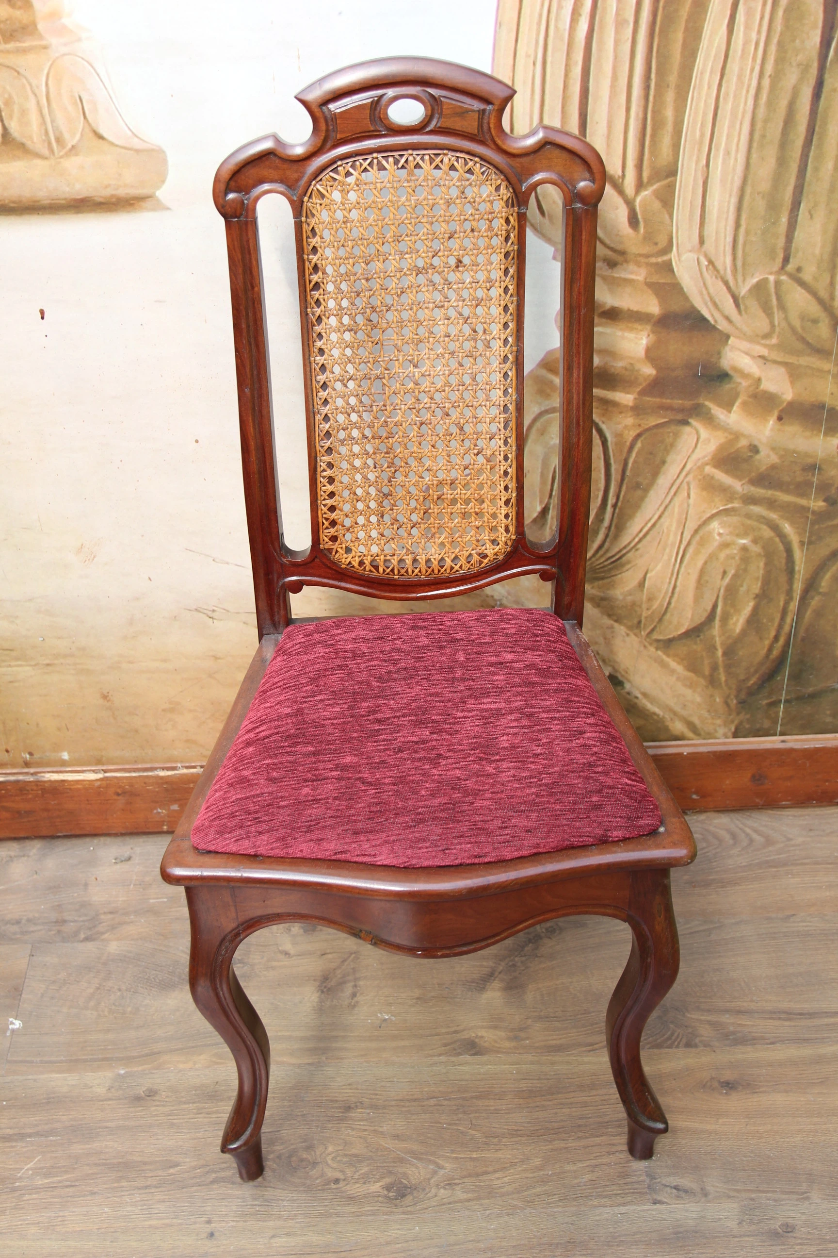 Besonders auffällig sind die wunderschönen Verzierungen. Die Sitzfläche ist mit rotem Stoff bezogen und die Rückenlehne ist mit Korbgeflechht.