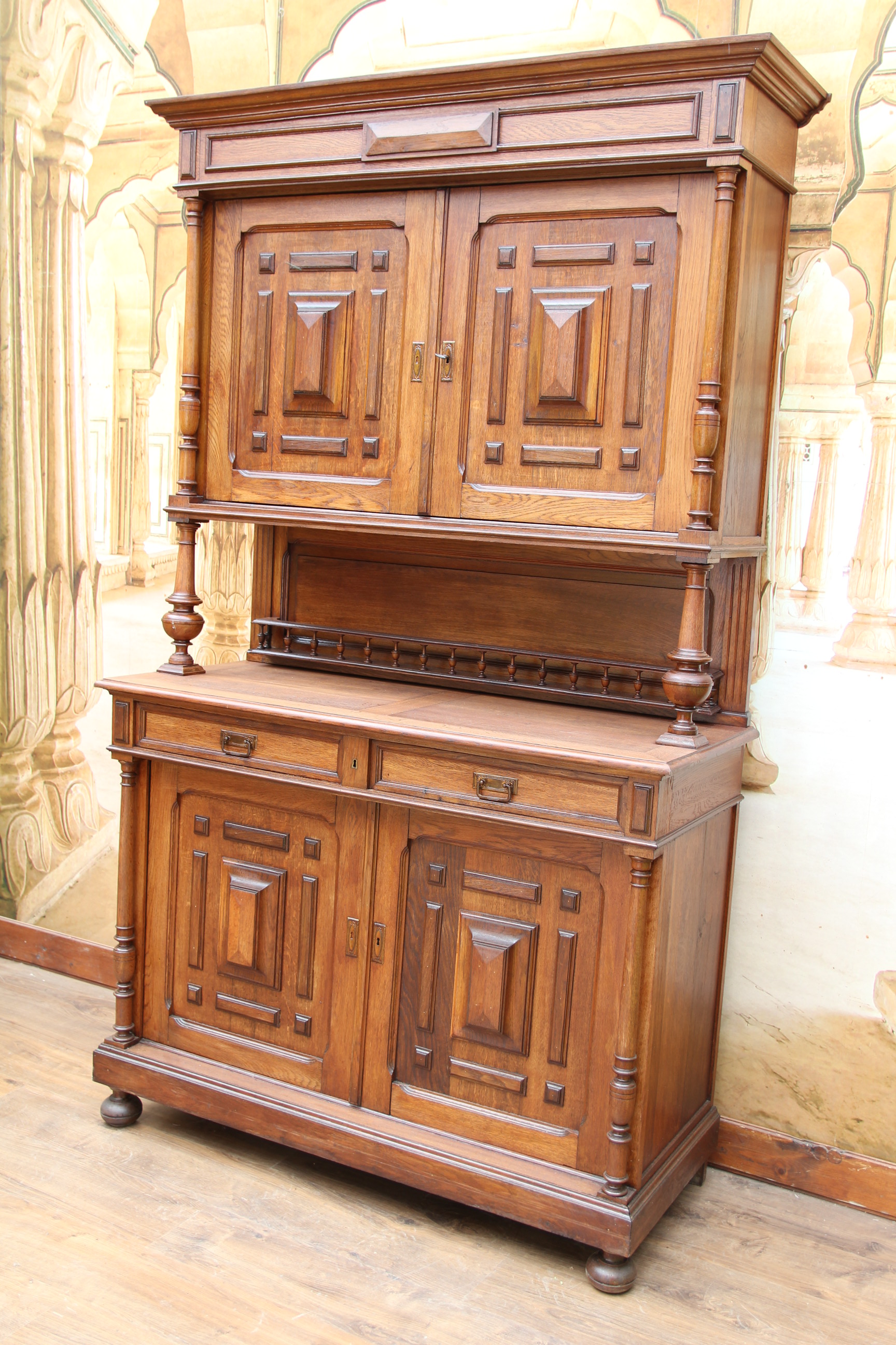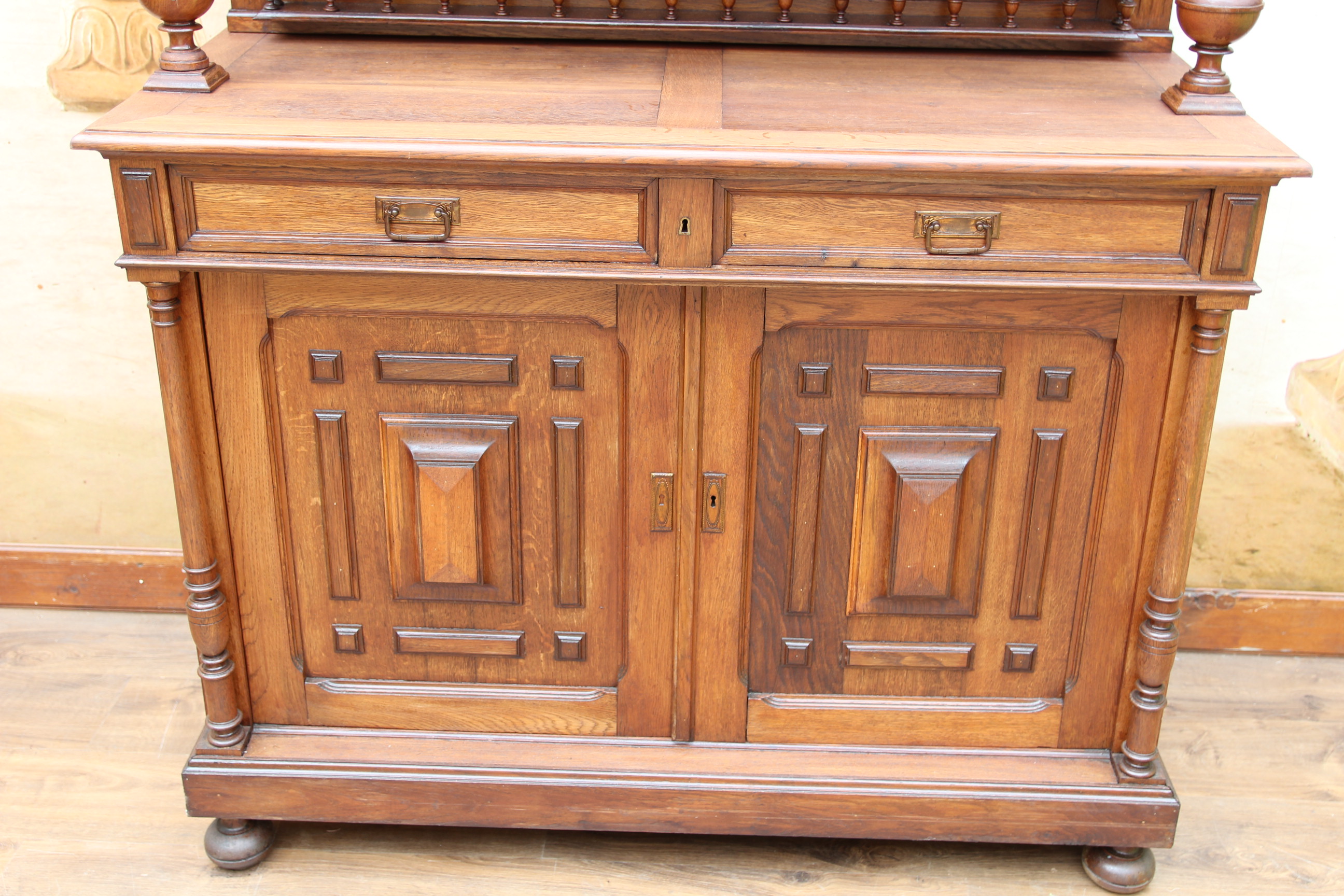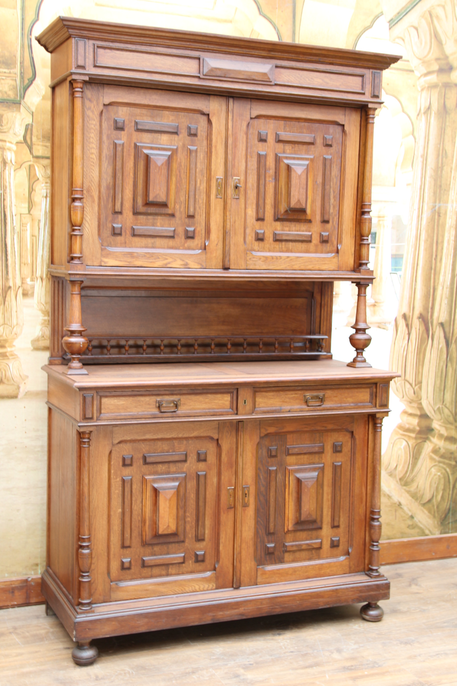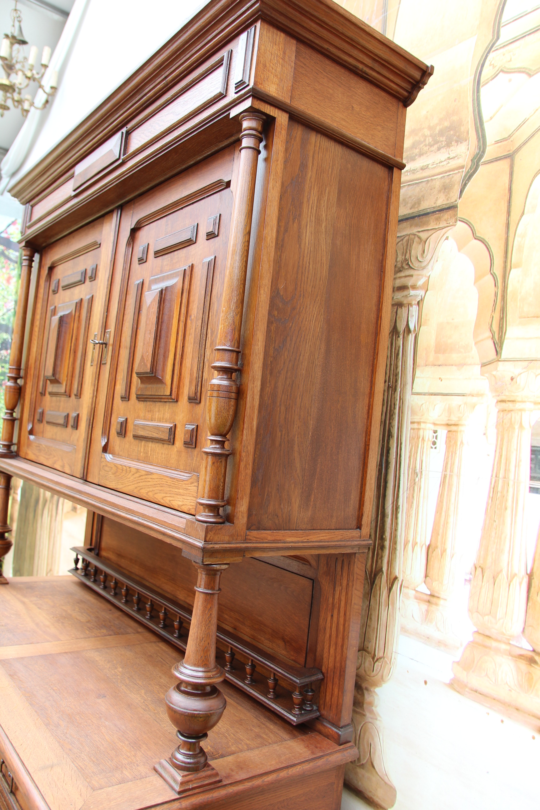 ein zauberhaftes seltenes antikes massives Gründerzeit Buffet ca.1880 Das schöne Stück hat oben zwei Türen und unten zwei Schubfächen und zwei Türen. Das Holz ist massiv Eichenholz. Das Schloß ist voll funktionsfähig und es ist ein Schlüssel vorhanden. Das edle Stück ist teilweise zerlegbar. Die Kommode hatte mal minimal altersbedingt den Holzwurm zu Gast, der wurde erfolgreich behandelt und ist nicht mehr vorhanden. Das schöne Stück stammt aus Europa und ist eine wunderschöne seltene hochwertige Antiquität. Maße: Höhe 228 cm Breite 136 cm Tiefe 54 cm