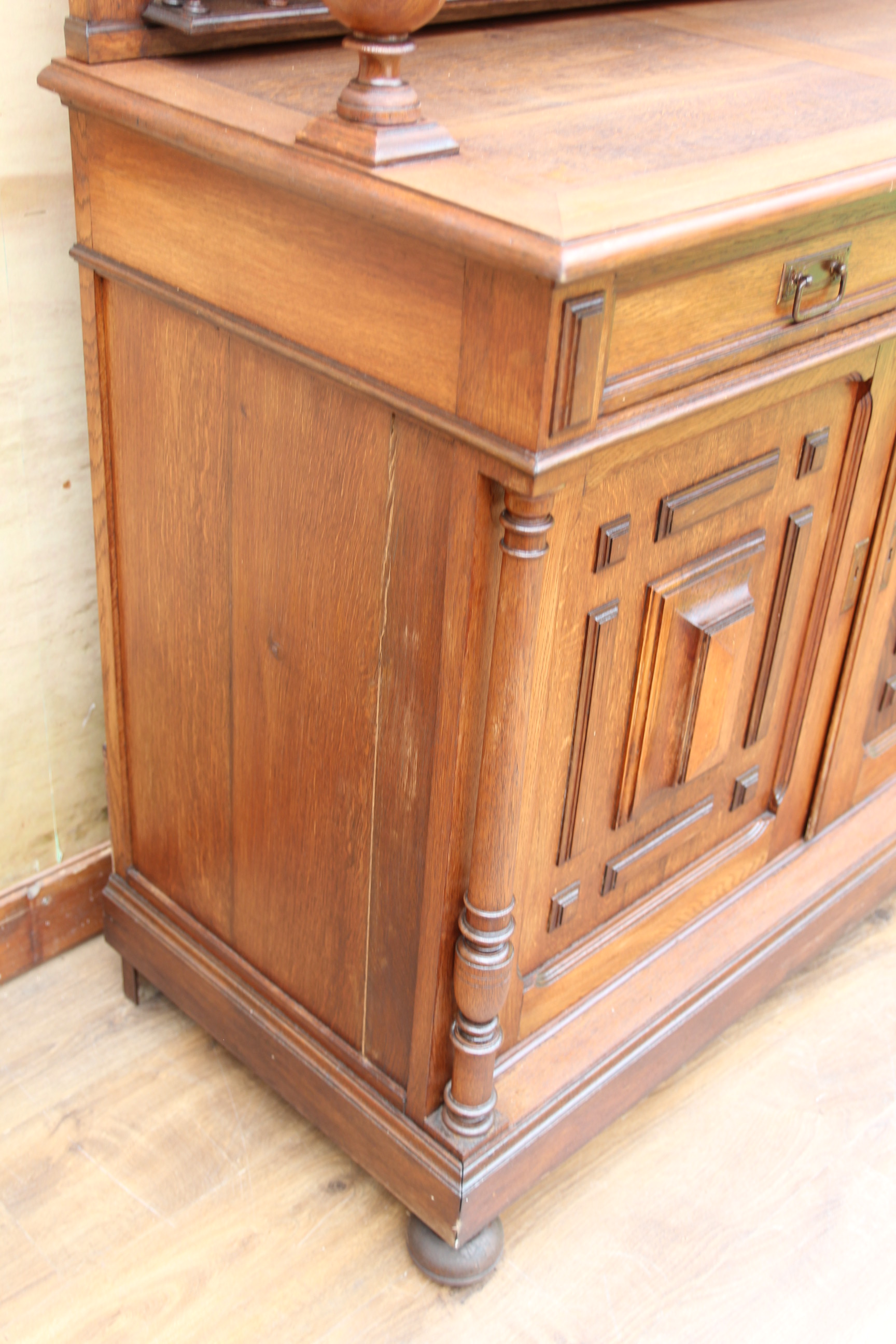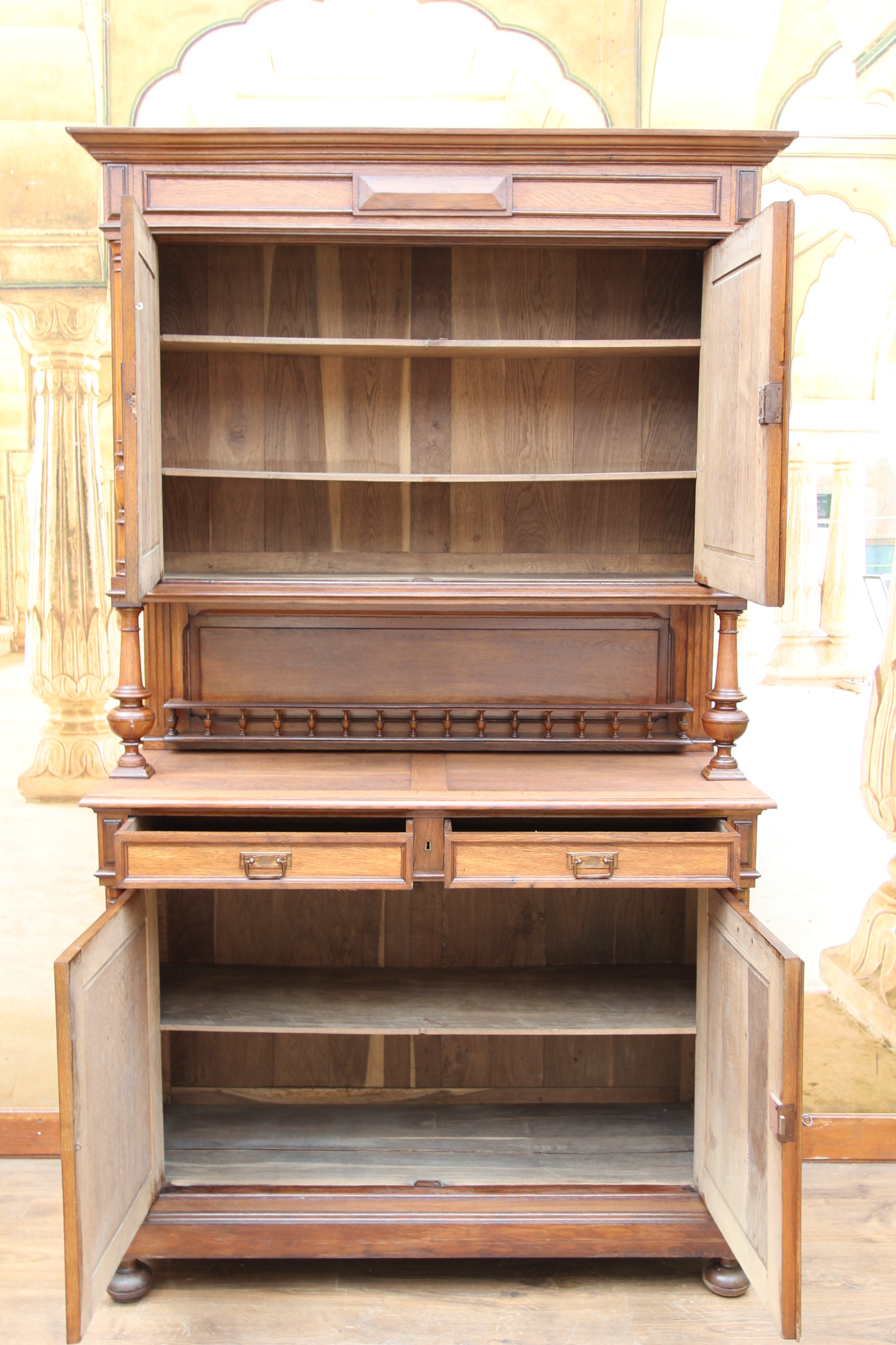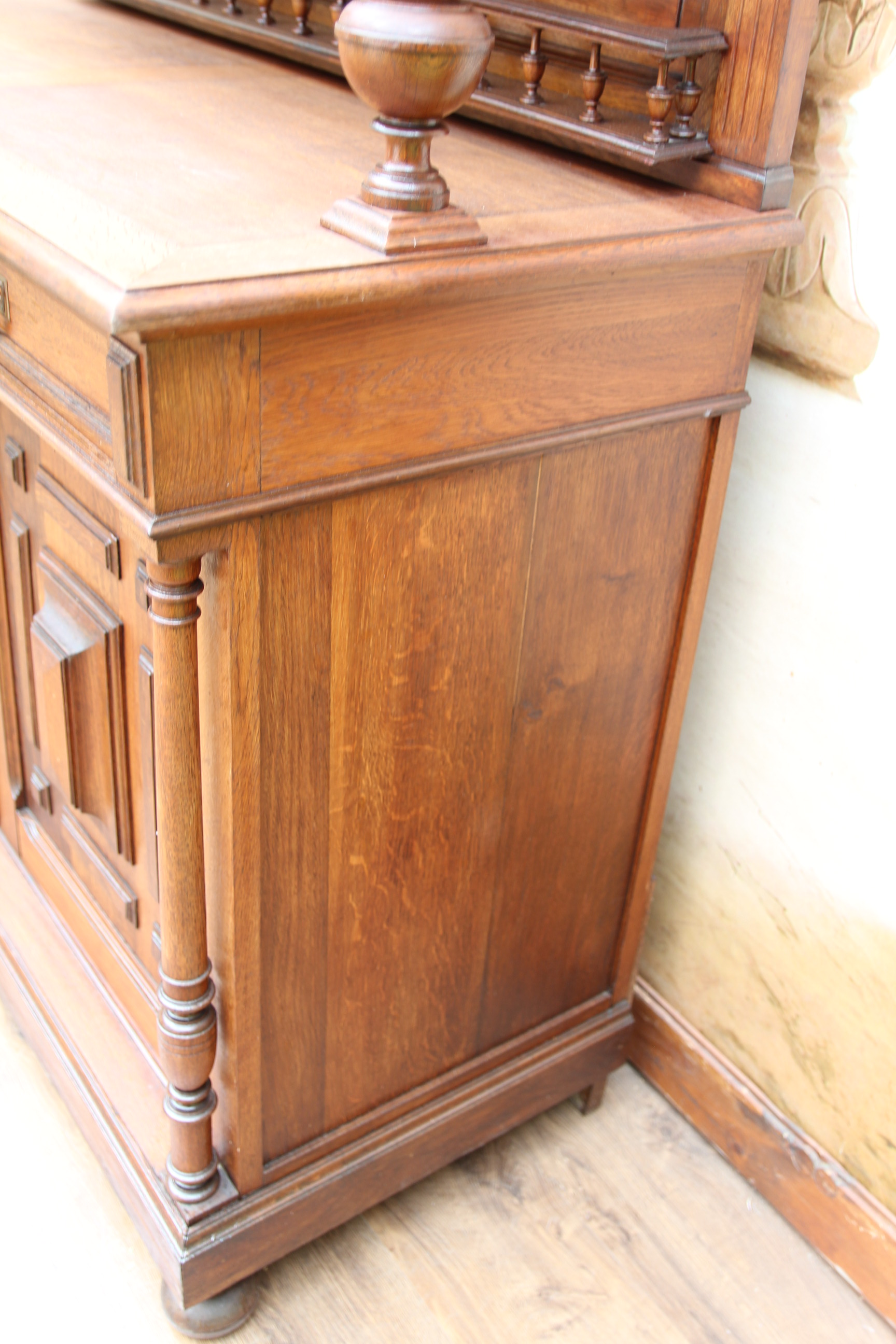 ein zauberhaftes seltenes antikes massives Gründerzeit Buffet ca.1880 Das schöne Stück hat oben zwei Türen und unten zwei Schubfächen und zwei Türen. Das Holz ist massiv Eichenholz. Das Schloß ist voll funktionsfähig und es ist ein Schlüssel vorhanden. Das edle Stück ist teilweise zerlegbar. Die Kommode hatte mal minimal altersbedingt den Holzwurm zu Gast, der wurde erfolgreich behandelt und ist nicht mehr vorhanden. Das schöne Stück stammt aus Europa und ist eine wunderschöne seltene hochwertige Antiquität. Maße: Höhe 228 cm Breite 136 cm Tiefe 54 cm