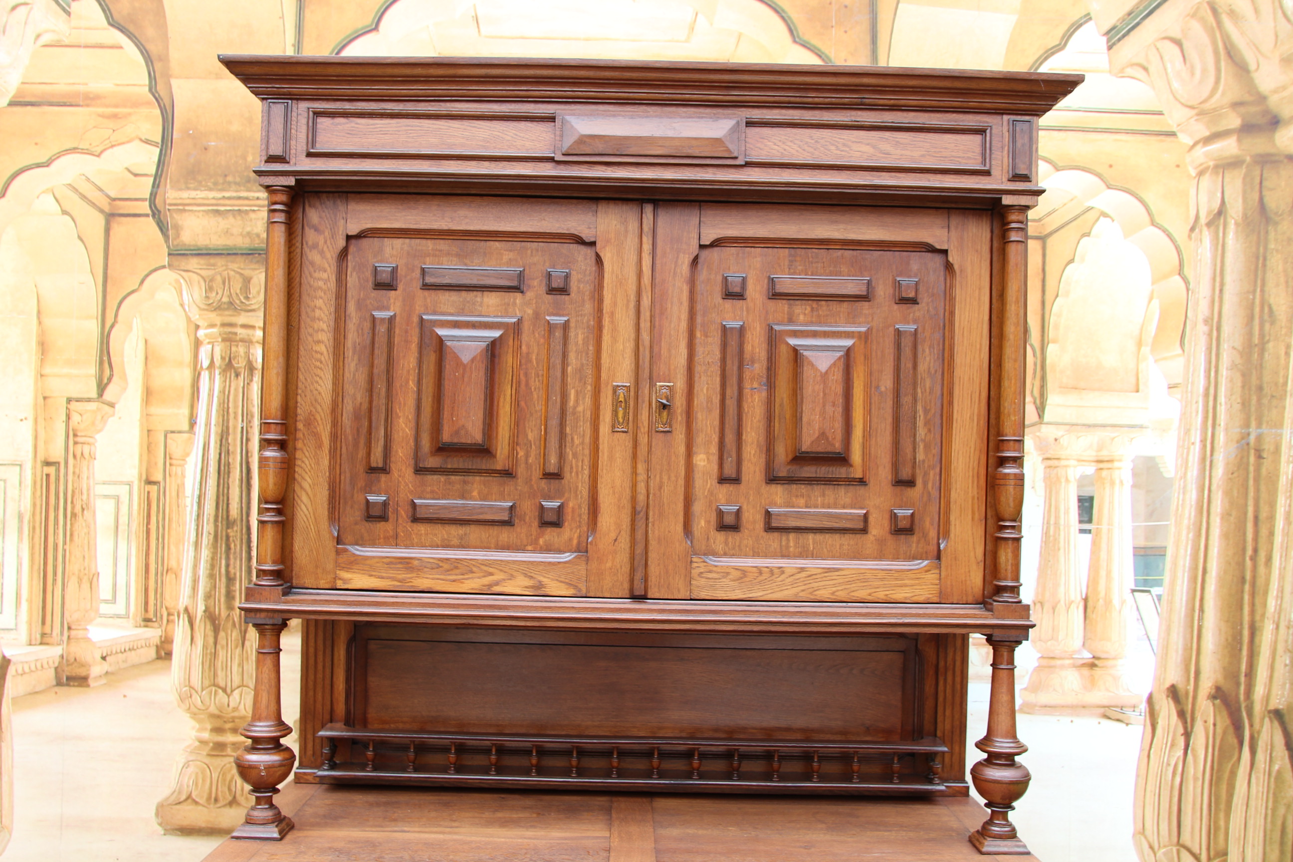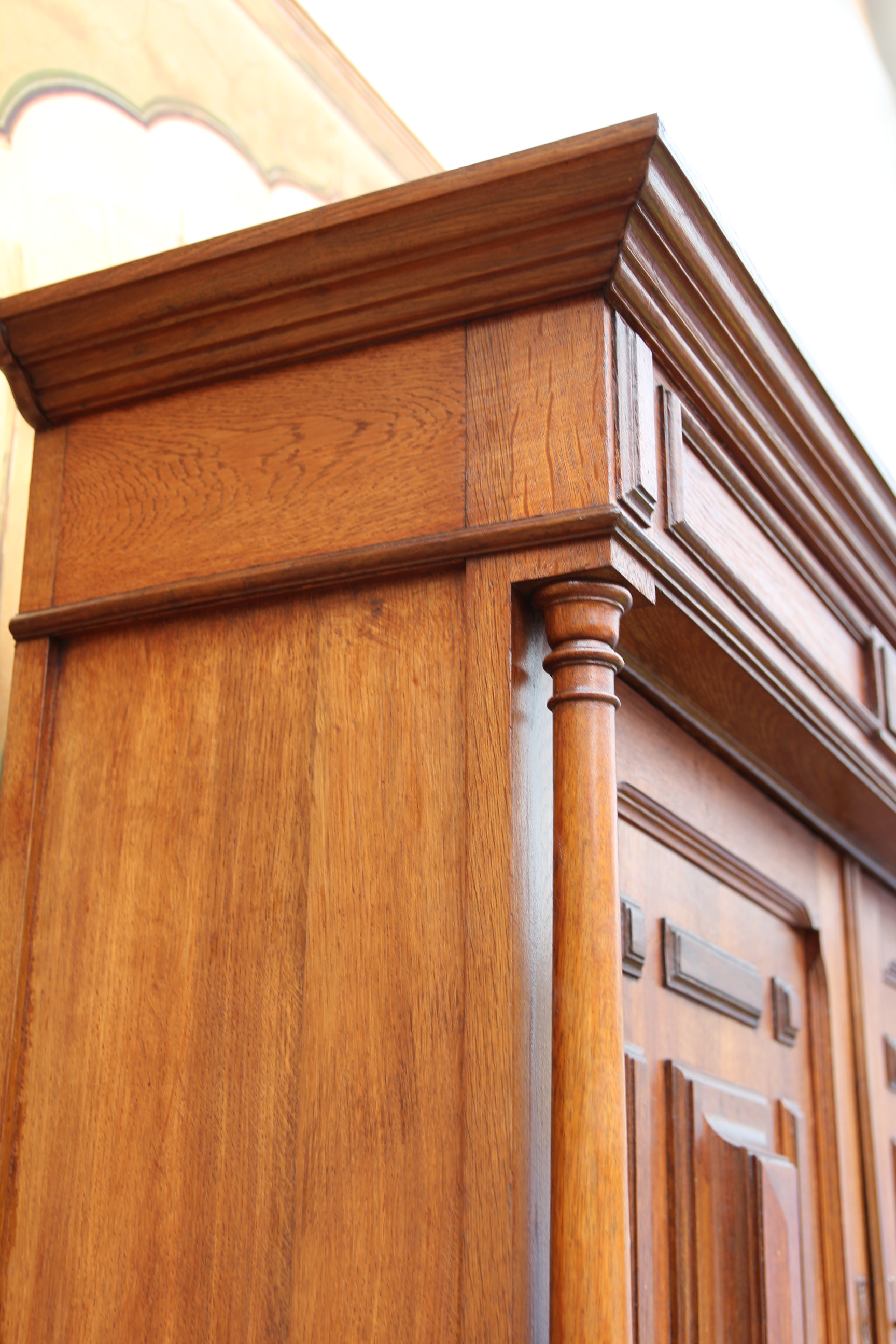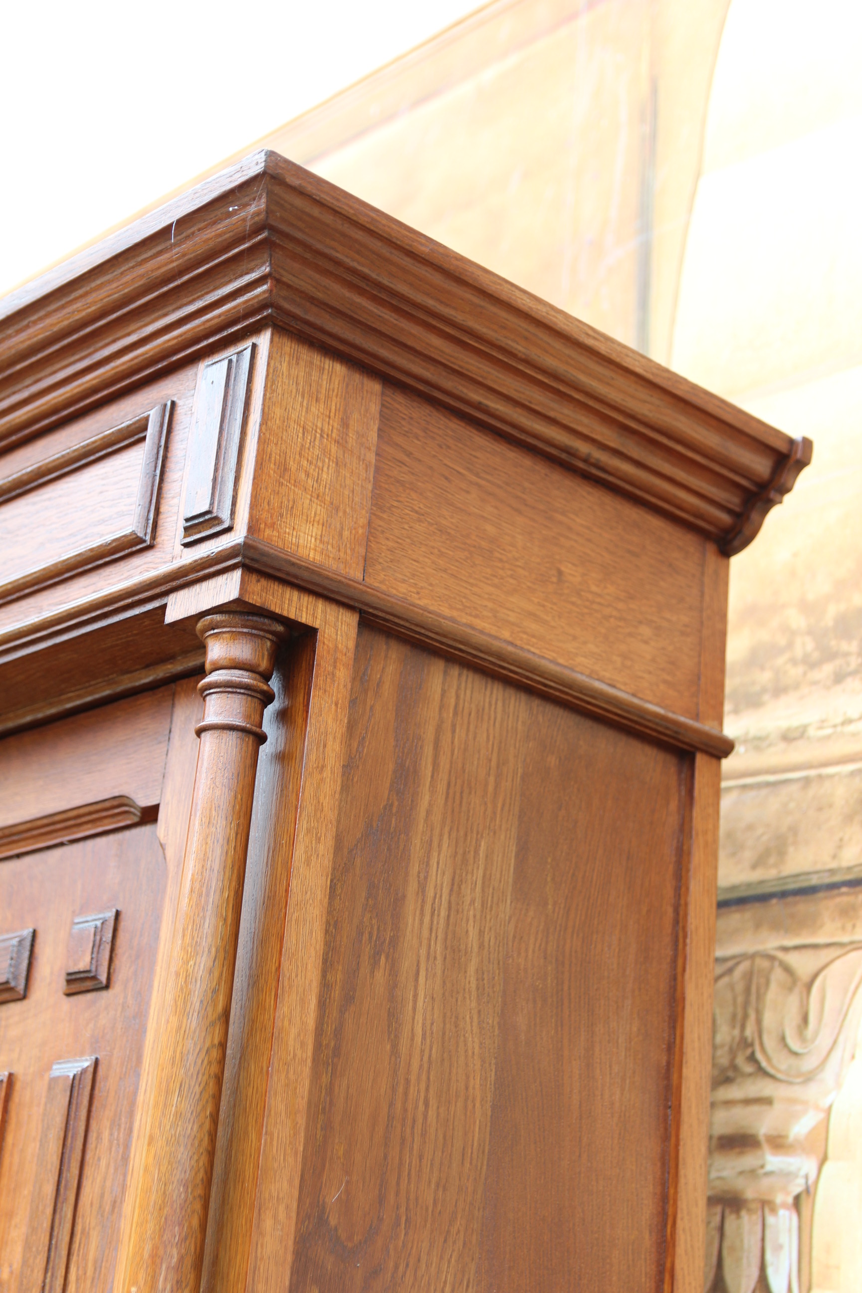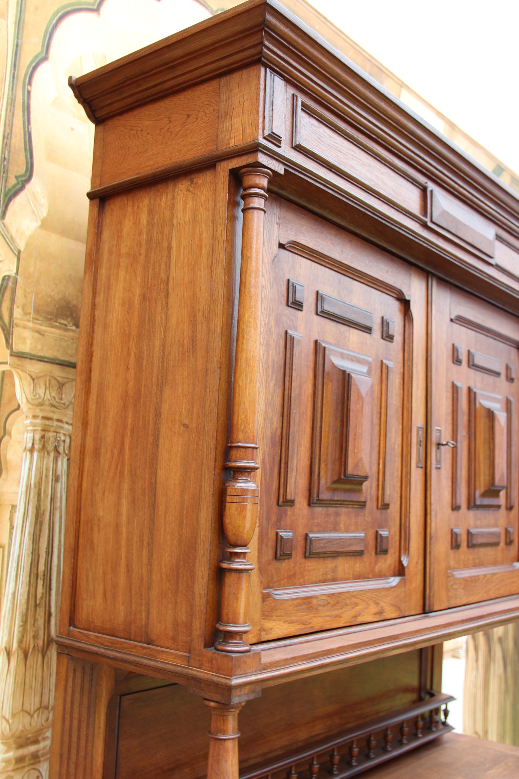 ein zauberhaftes seltenes antikes massives Gründerzeit Buffet ca.1880 Das schöne Stück hat oben zwei Türen und unten zwei Schubfächen und zwei Türen. Das Holz ist massiv Eichenholz. Das Schloß ist voll funktionsfähig und es ist ein Schlüssel vorhanden. Das edle Stück ist teilweise zerlegbar. Die Kommode hatte mal minimal altersbedingt den Holzwurm zu Gast, der wurde erfolgreich behandelt und ist nicht mehr vorhanden. Das schöne Stück stammt aus Europa und ist eine wunderschöne seltene hochwertige Antiquität. Maße: Höhe 228 cm Breite 136 cm Tiefe 54 cm