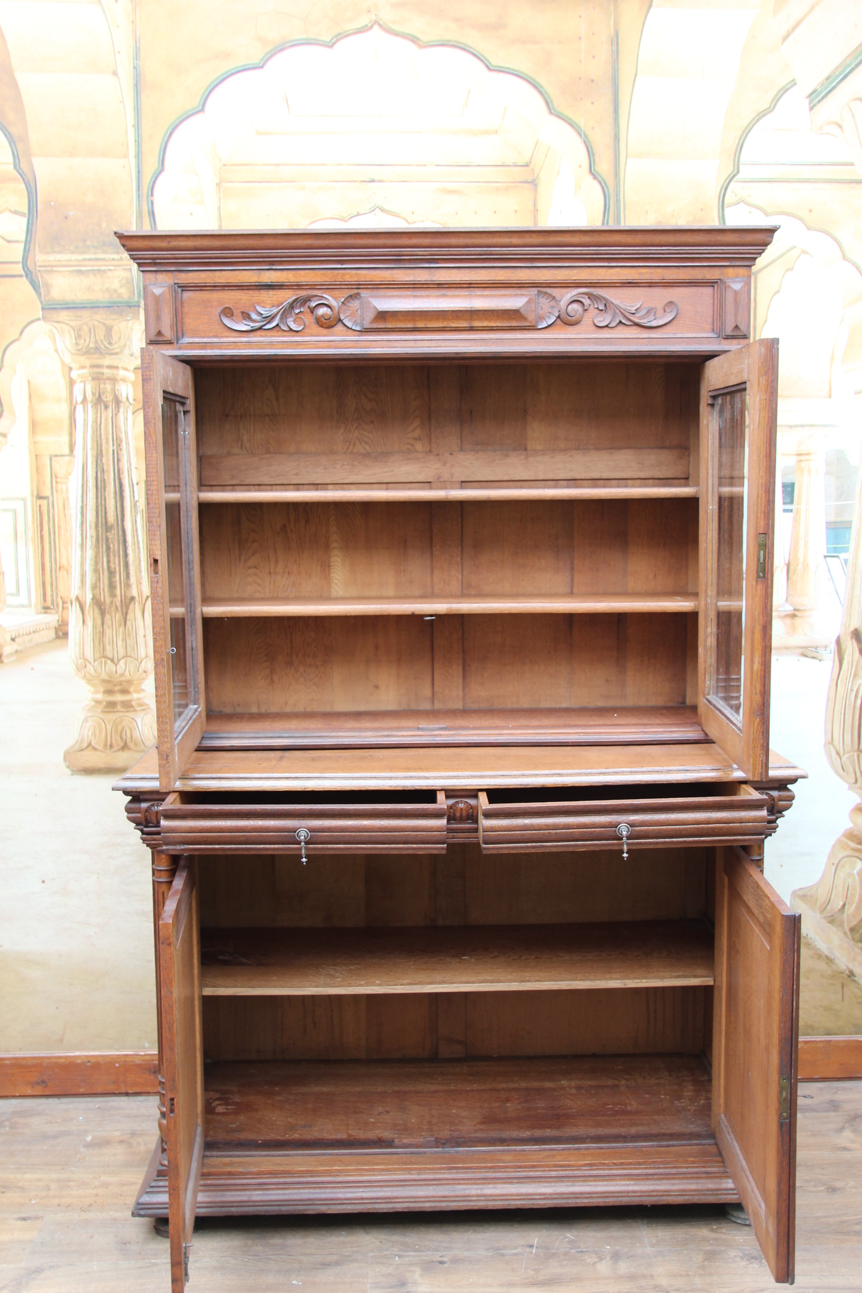 Gefertigt aus massivem Eichenholz enthält es außerdem oben 2 Türen mit Antikverglasung, 2 Schubfächer und unten 2 Türen.