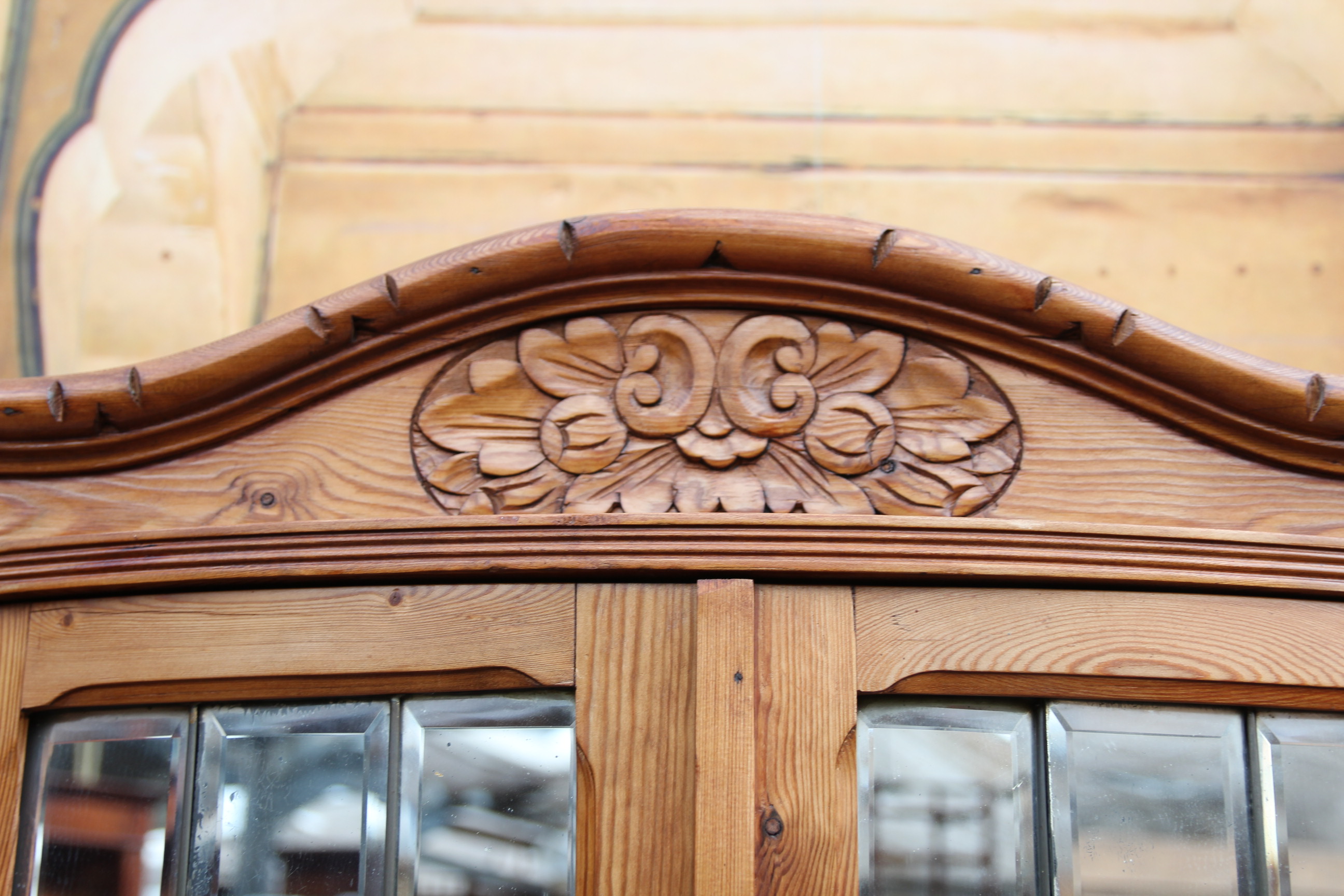 Das schöne Stück hat oben zwei Türen mit geschliffener Spiegelverglasung bietet es viel Stauraum.