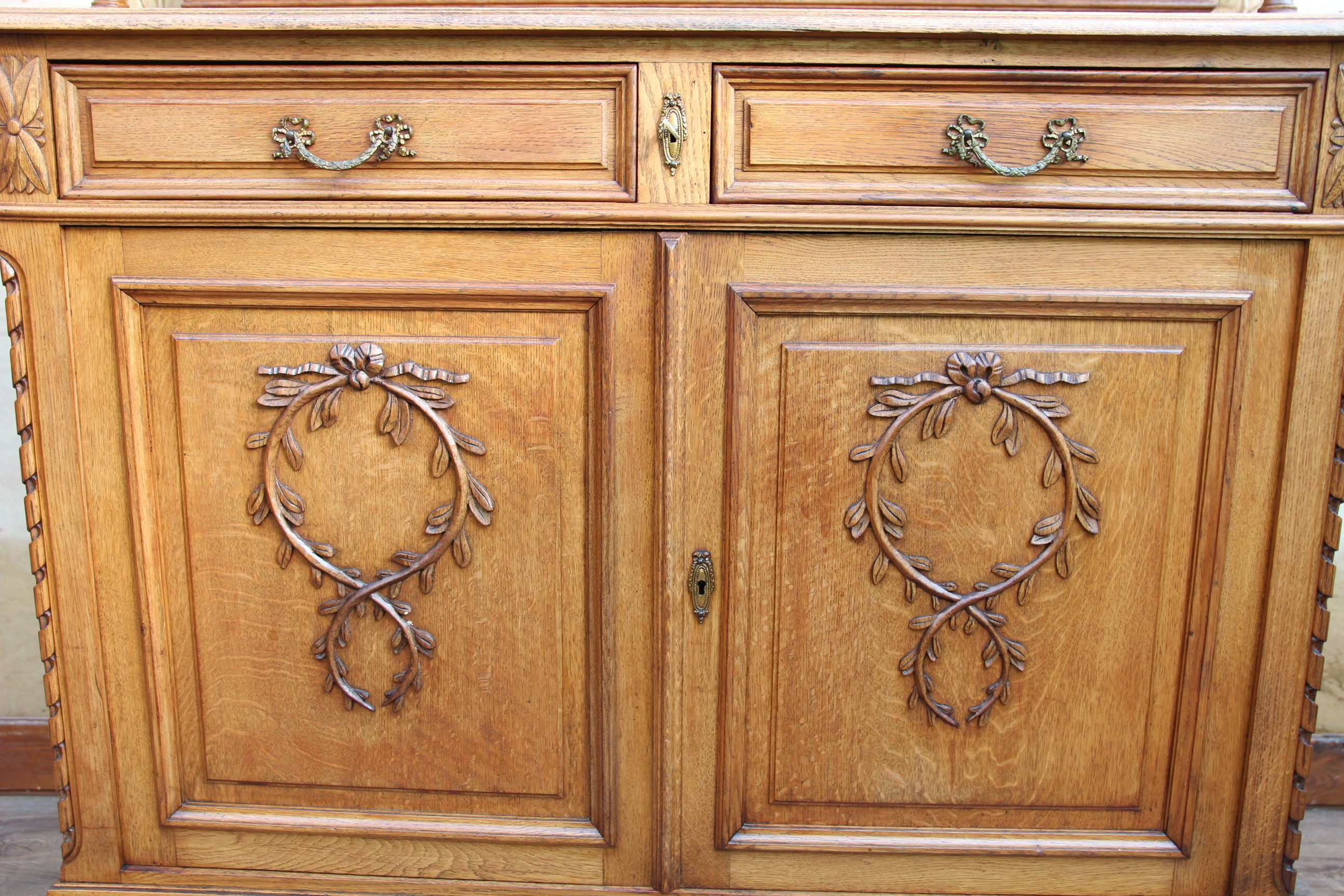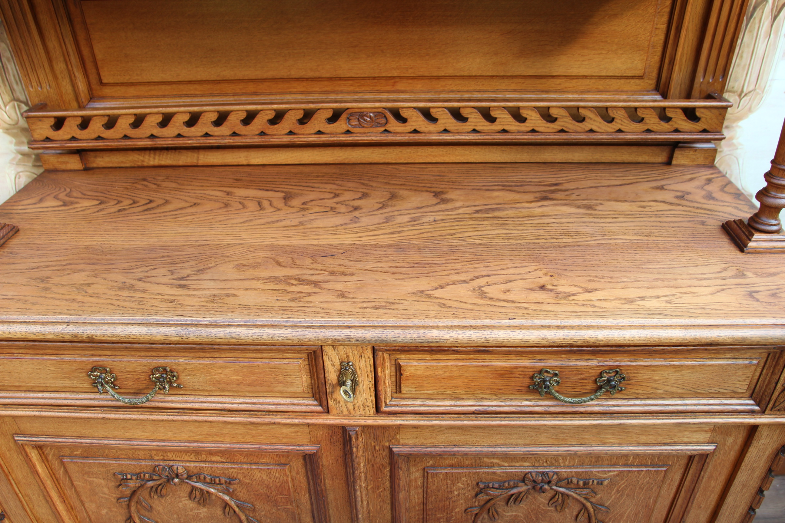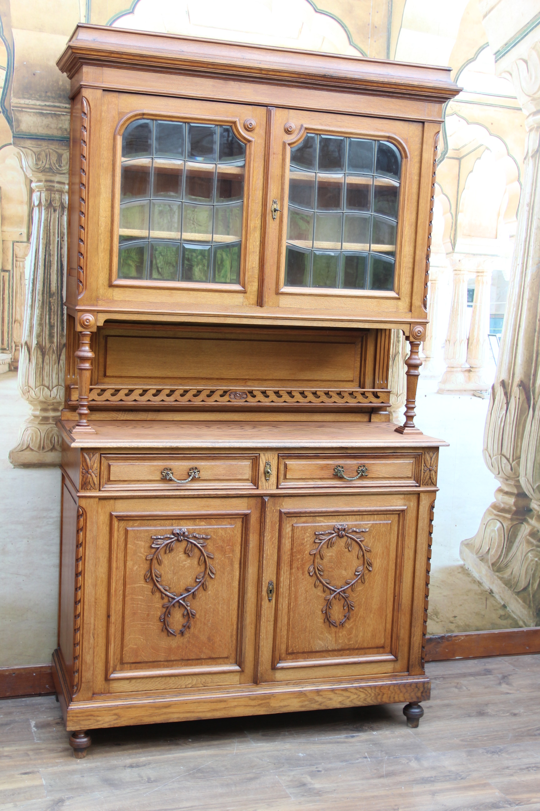 Gefertigt aus massivem Eichenholz enthält es außerdem oben 2 Türen mit geschliffener Antikverglasung, 2 Schubfächer und unten 2 Türen.