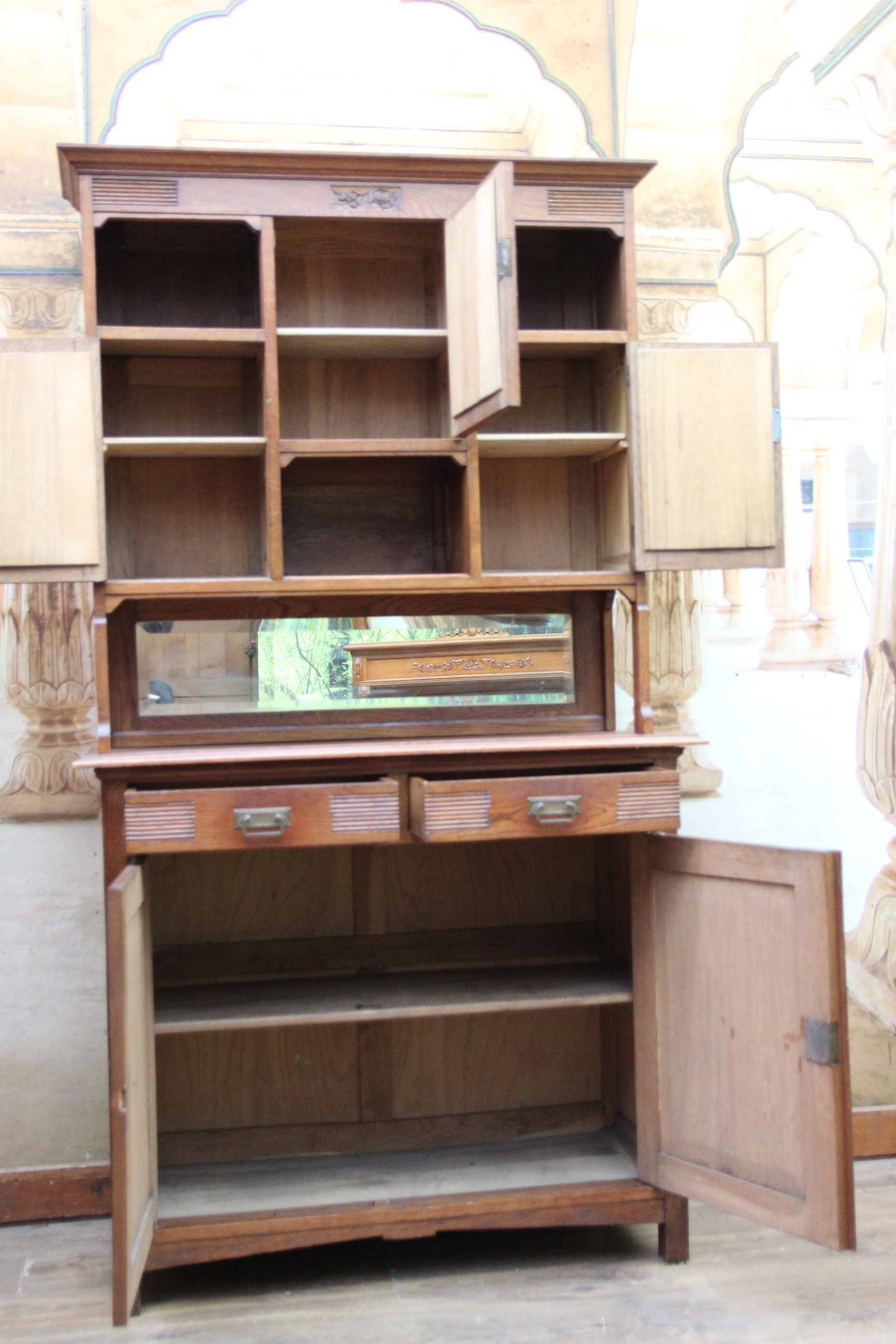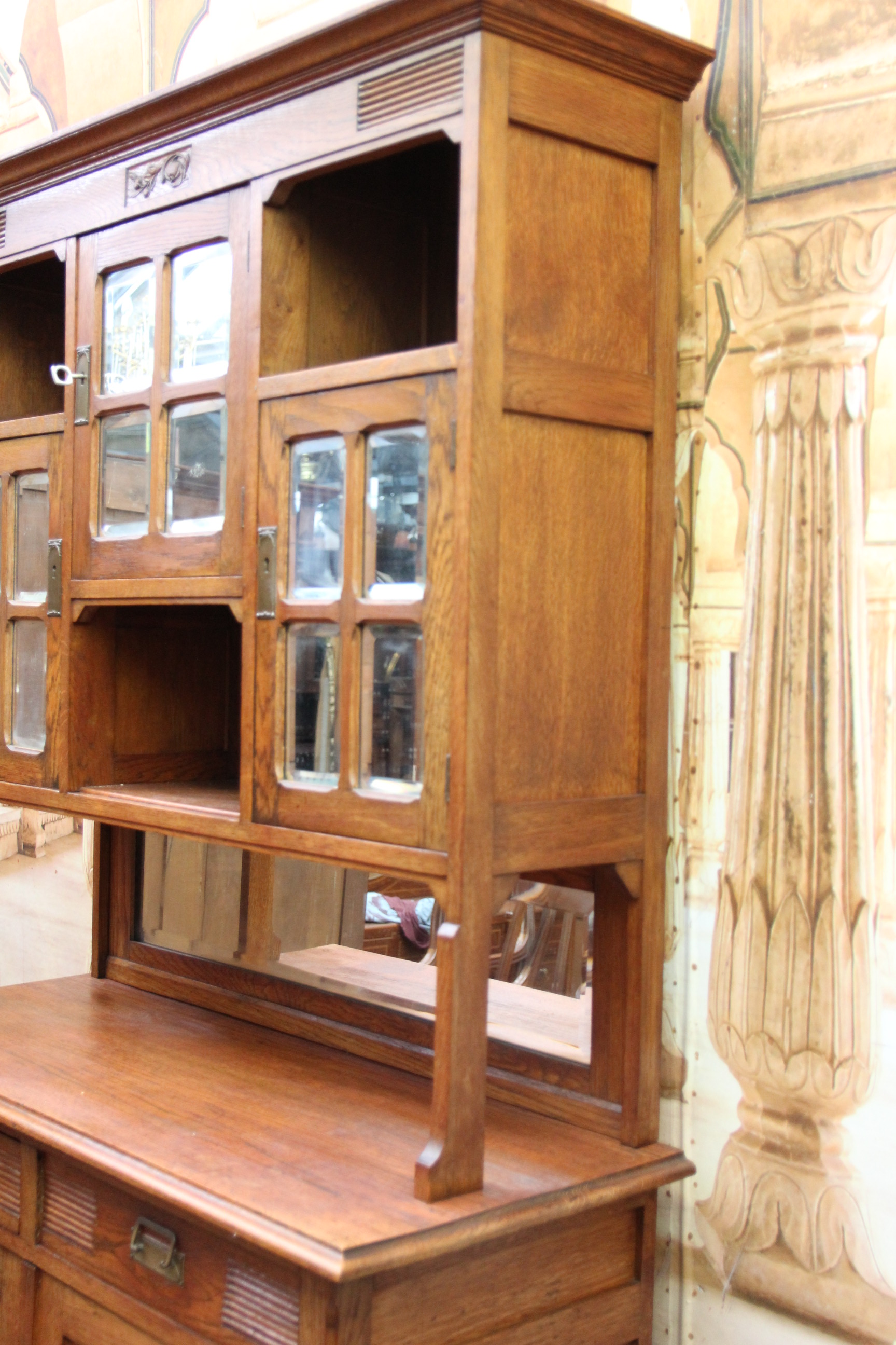 Das schöne Stück hat oben drei Türen mit geschliffener Spiegelverglasung bietet es viel Stauraum.