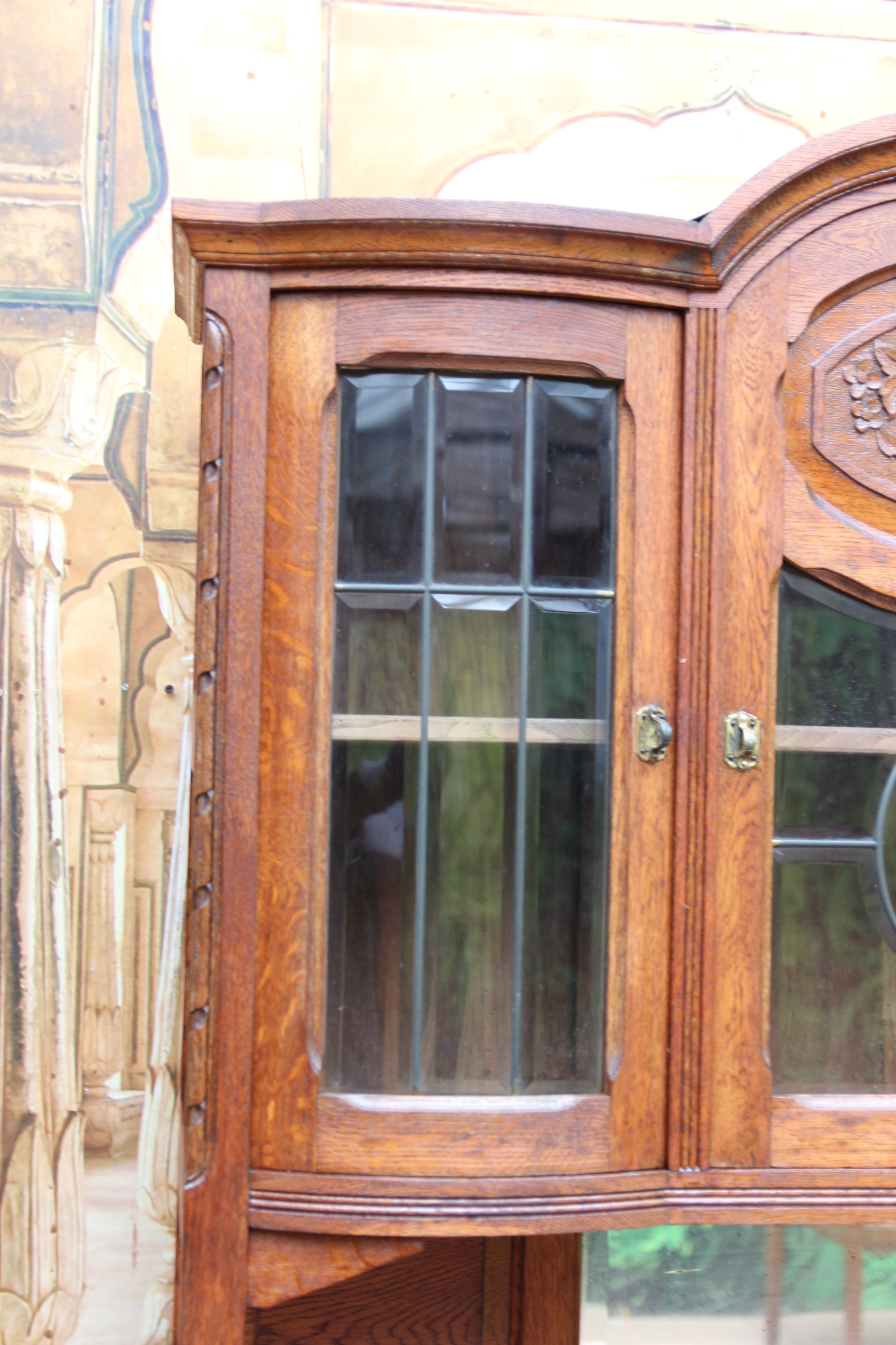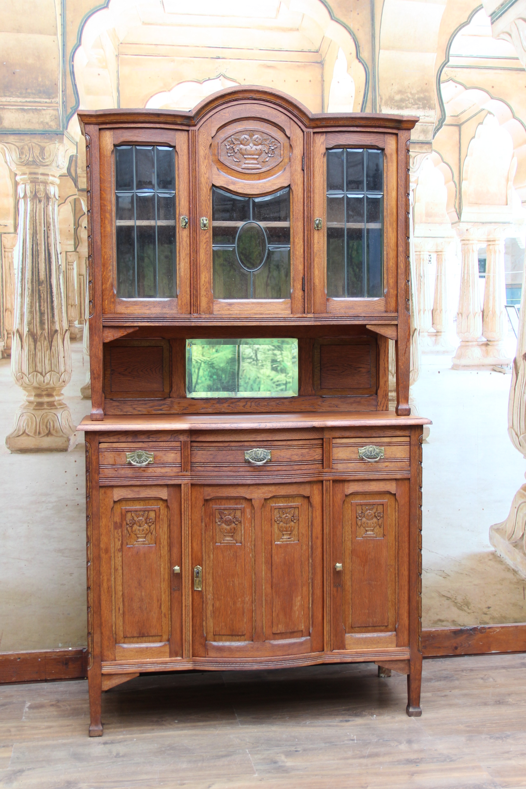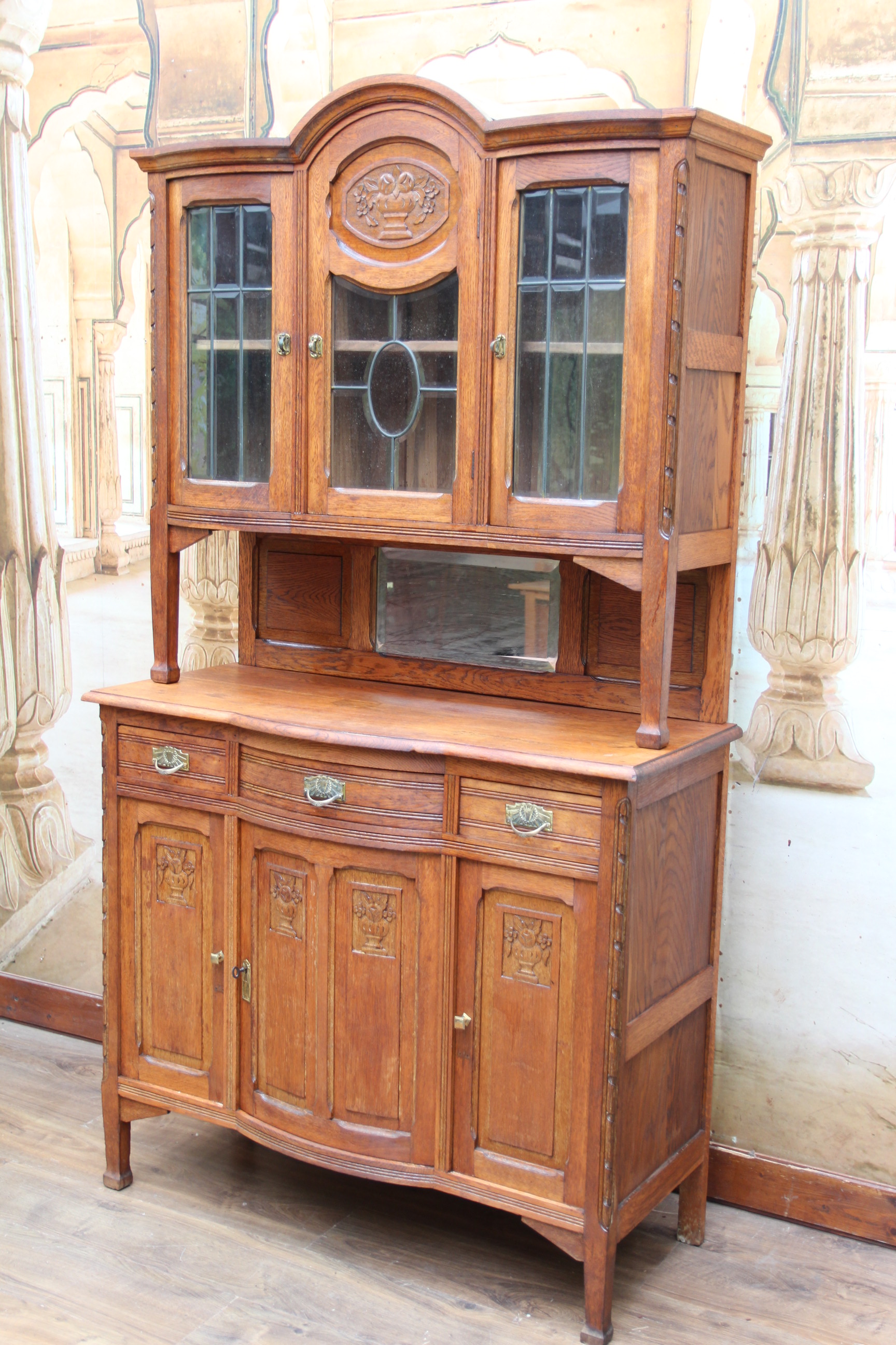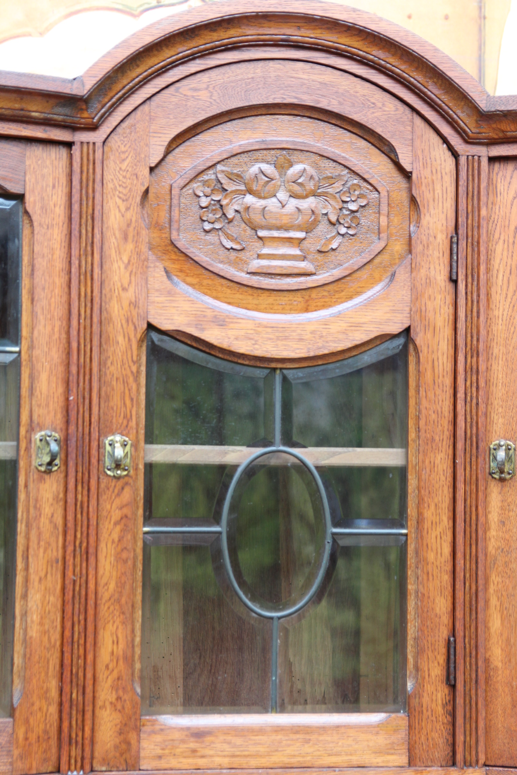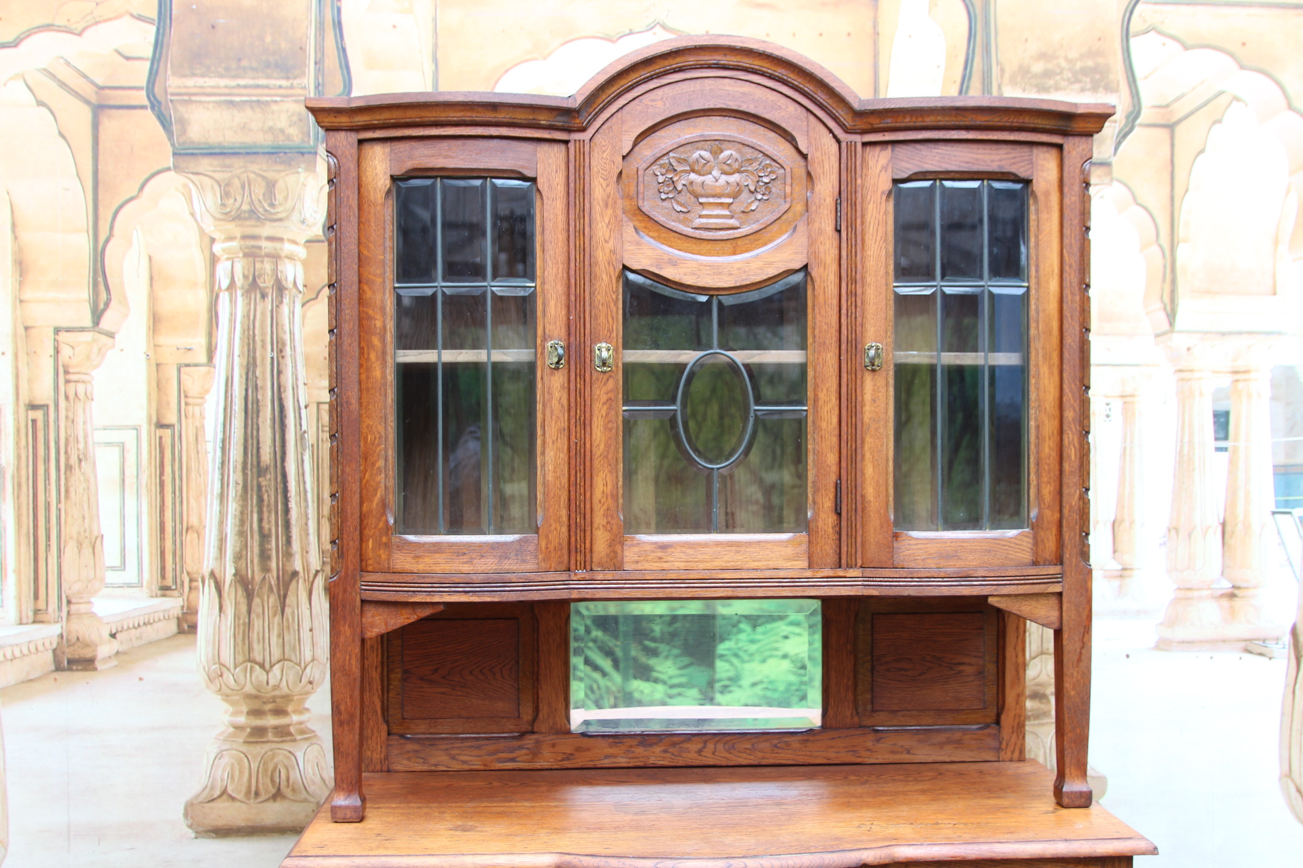 Das schöne Stück hat oben drei Türen mit geschliffener Verglasung bietet es viel Stauraum.