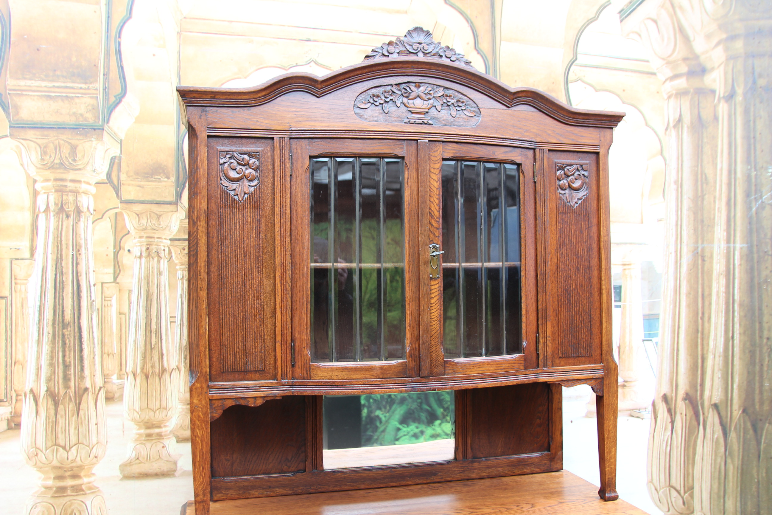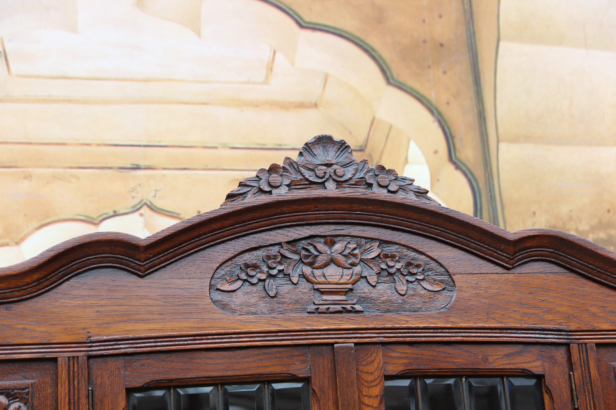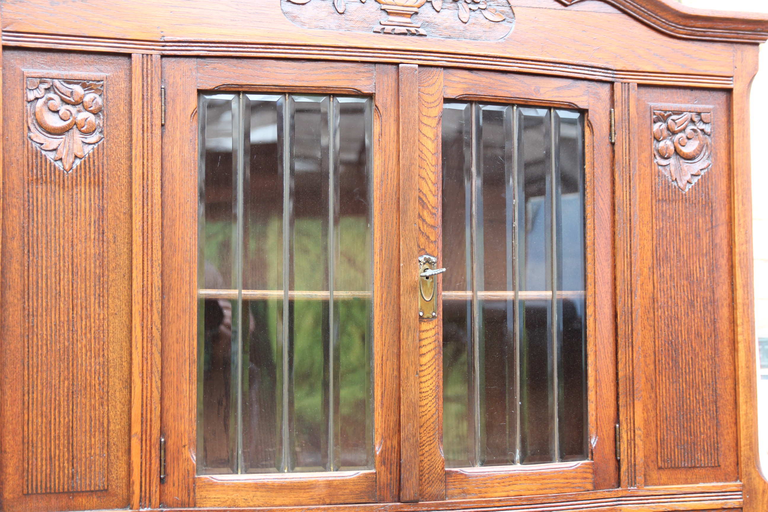Das schöne Stück hat oben zwei Türen mit geschliffener Verglasung und zwei Türen mit Schnitzereien.