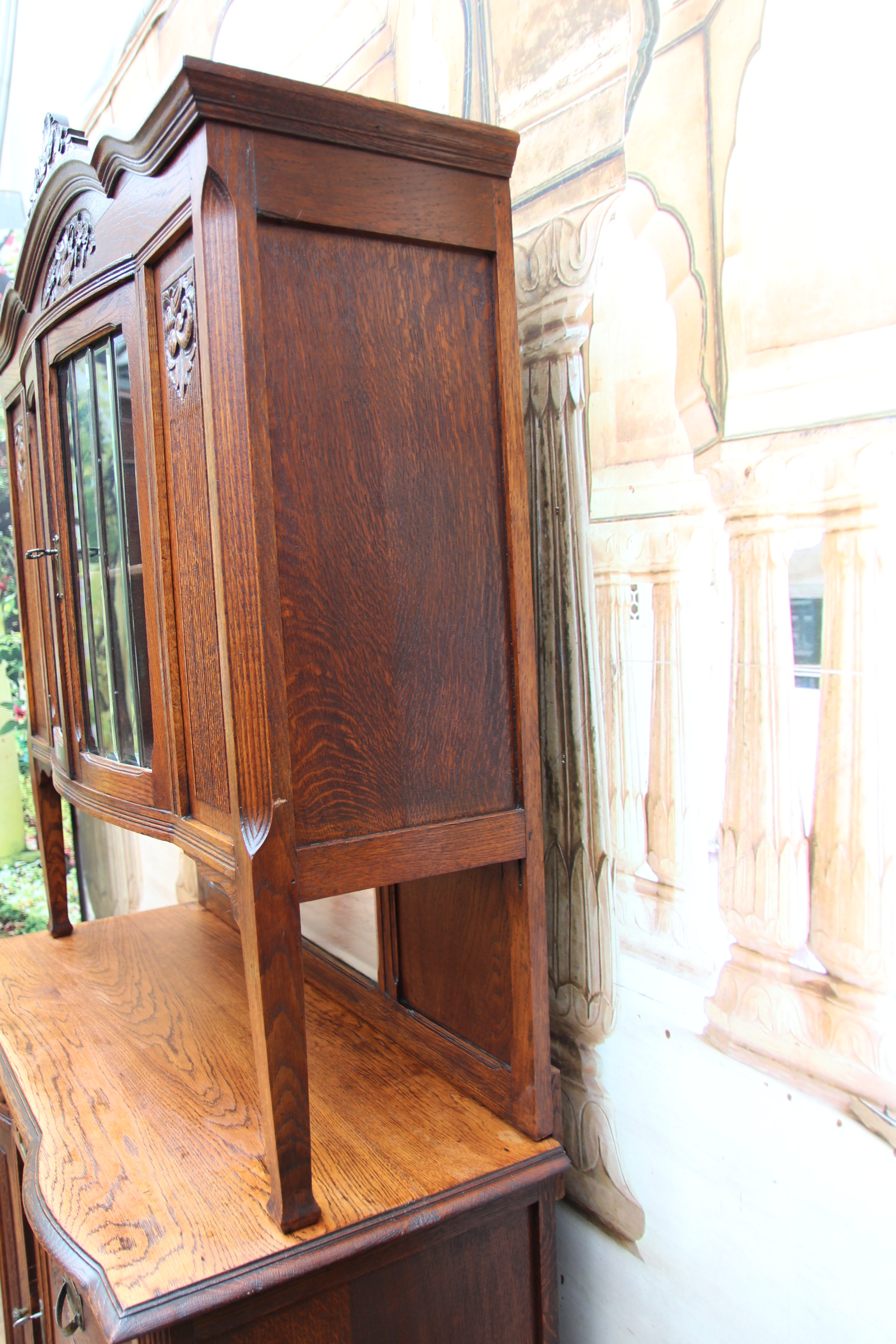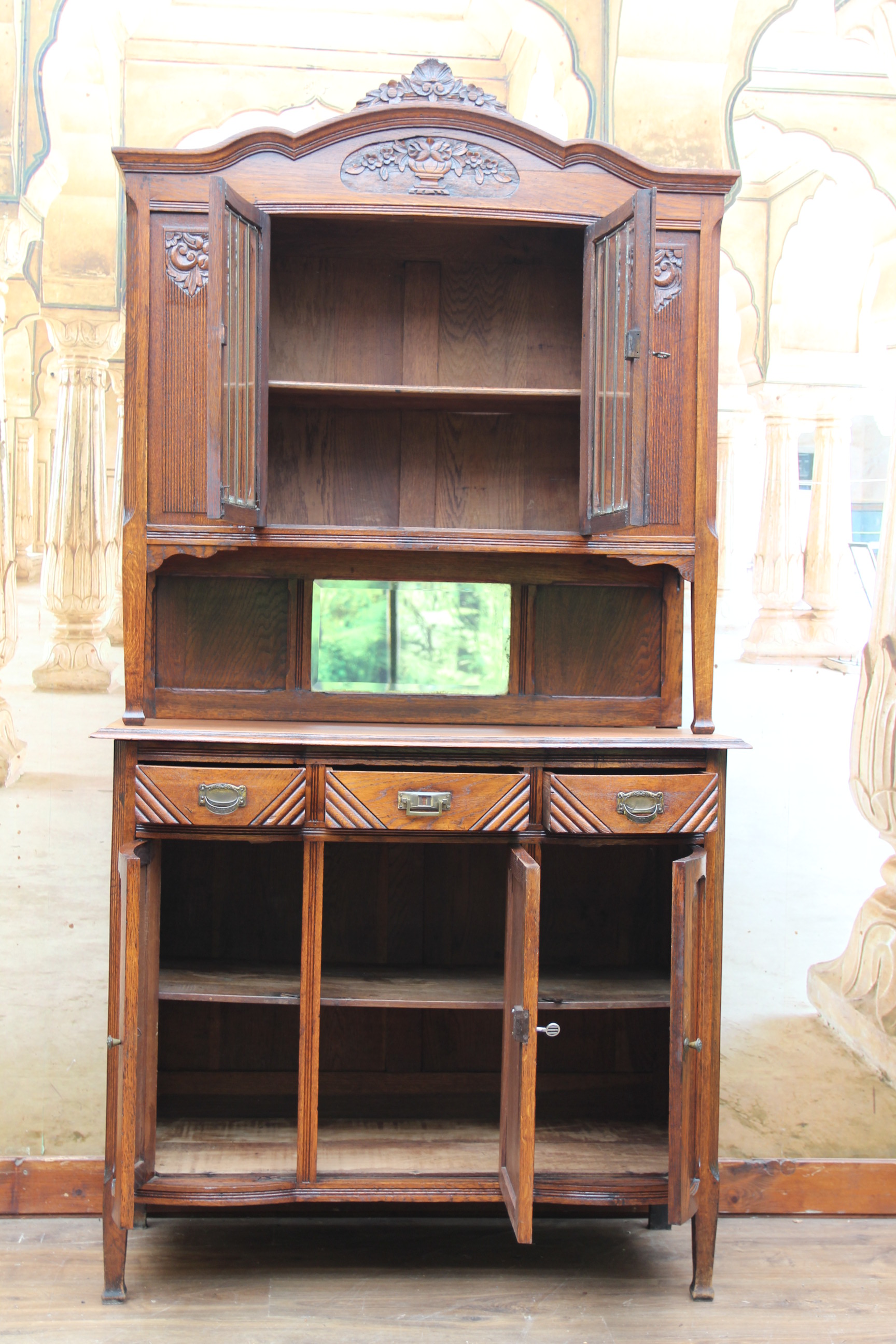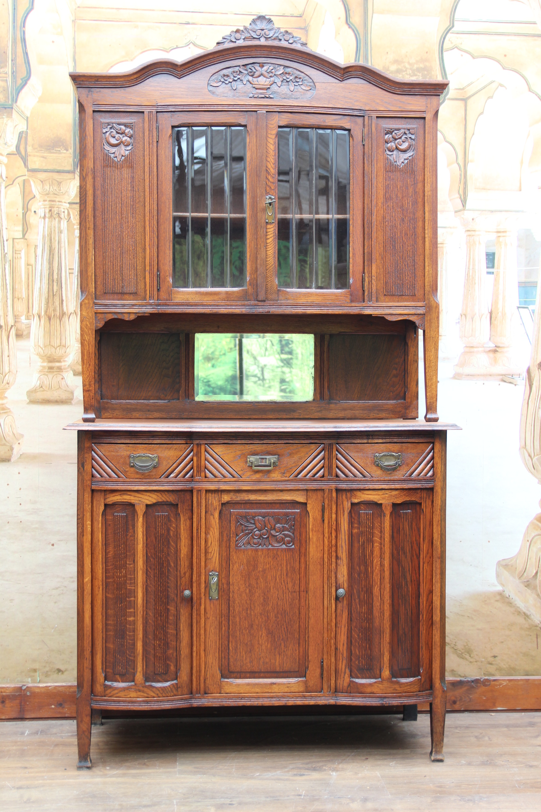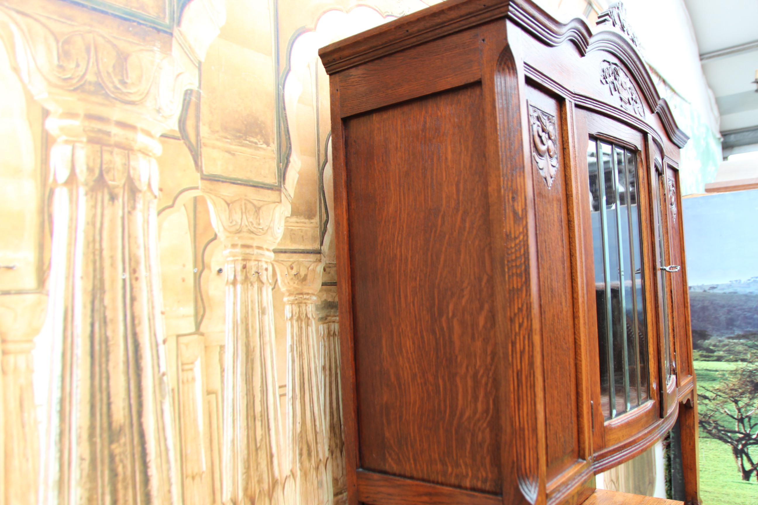 Das schöne Stück hat oben zwei Türen mit geschliffener Verglasung und zwei Türen mit Schnitzereien.