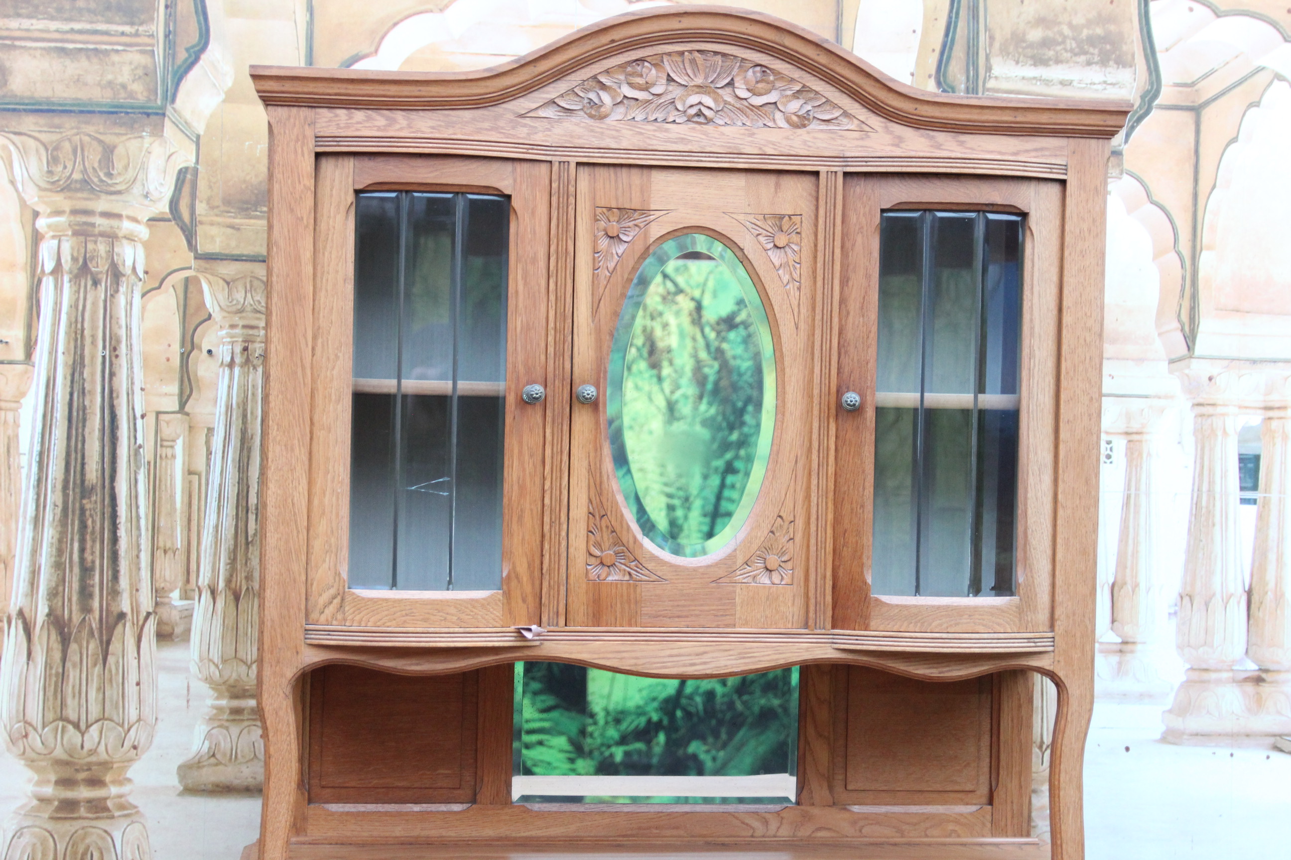 Das schöne Stück hat oben zwei Türen mit geschliffener Verglasung, in der Mitte mit geschliffener Spiegelverglasung.