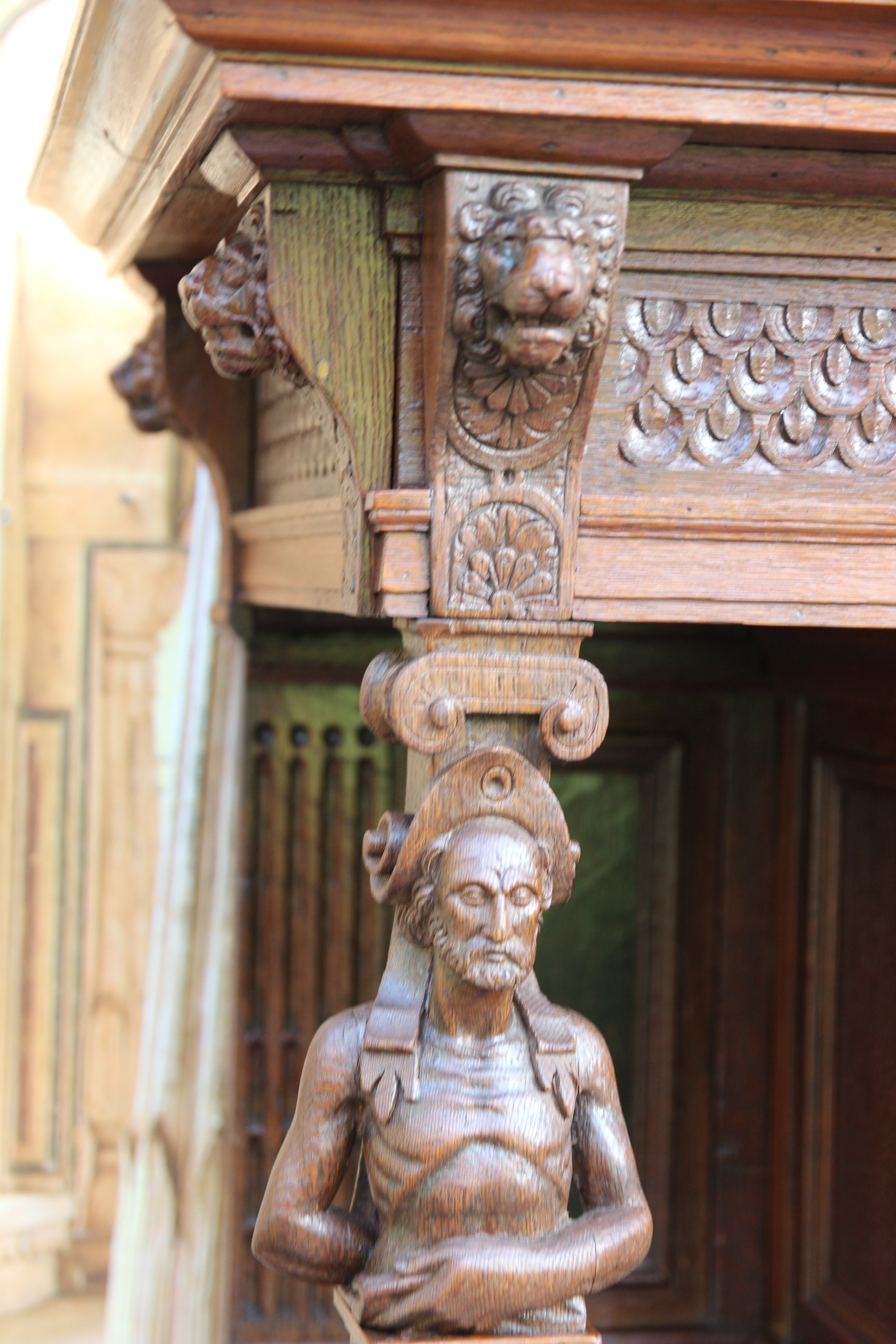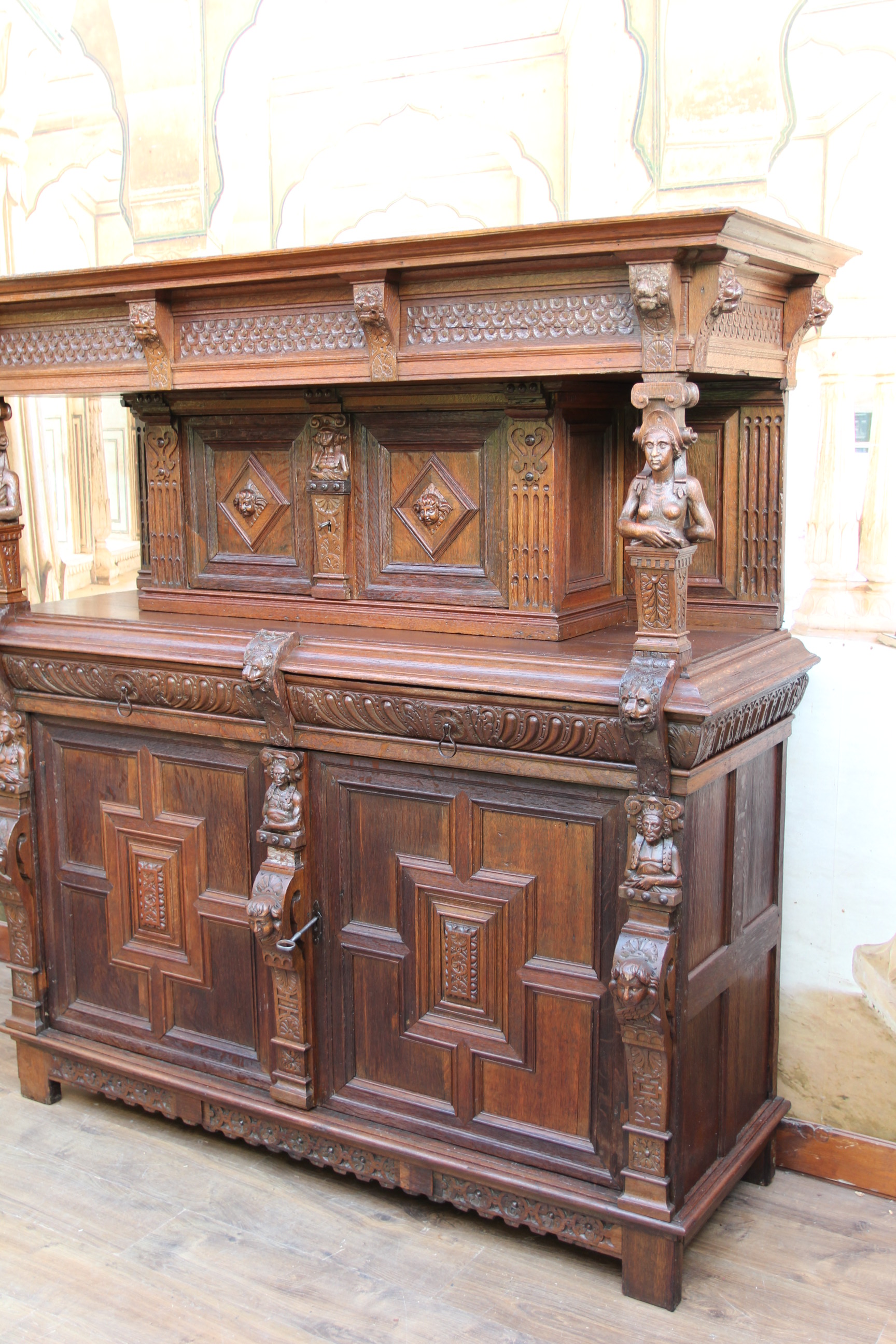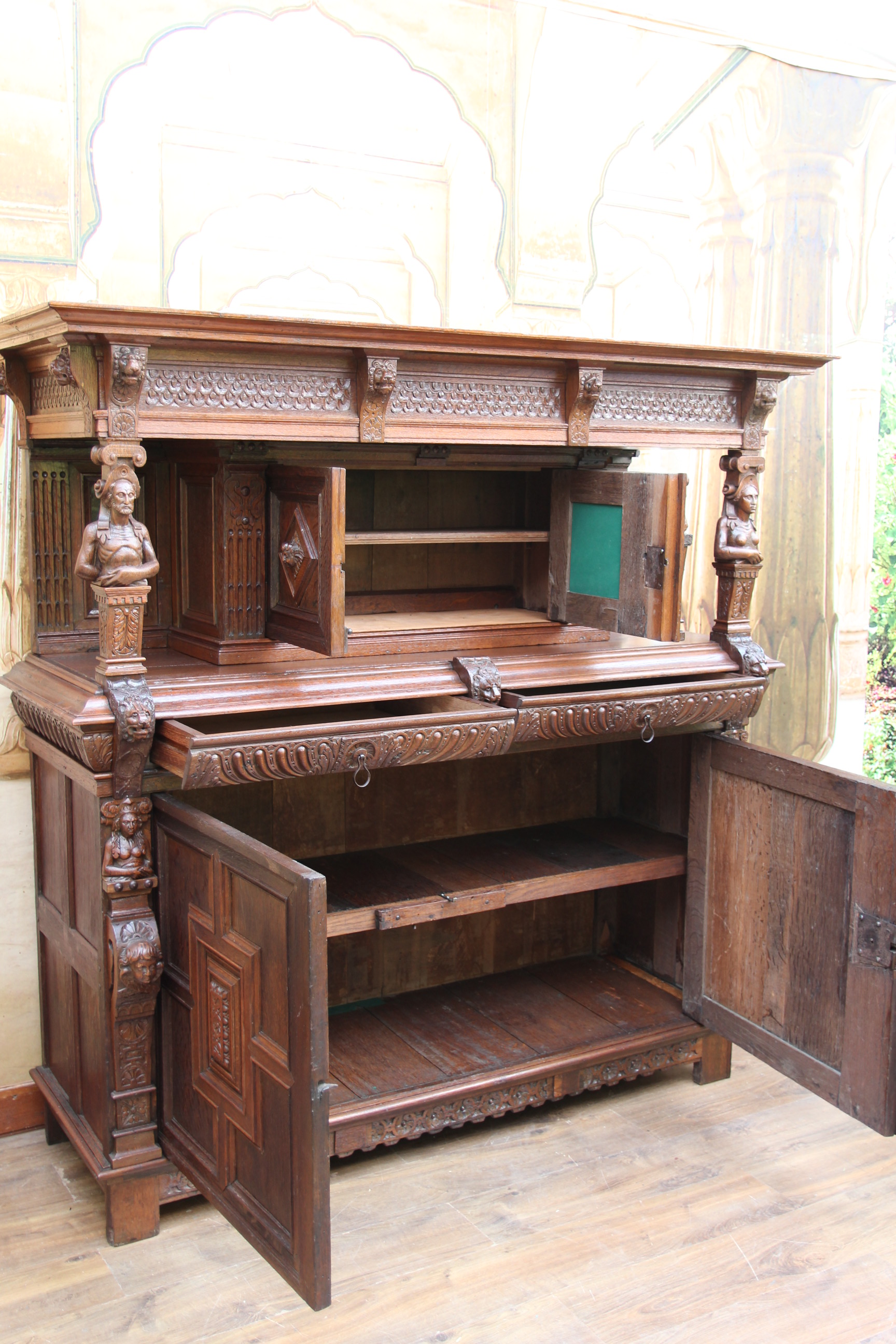 Gefertigt aus massivem Eichenholz enthält es außerdem insgesamt 2 Schubfächer und 4 Türen.