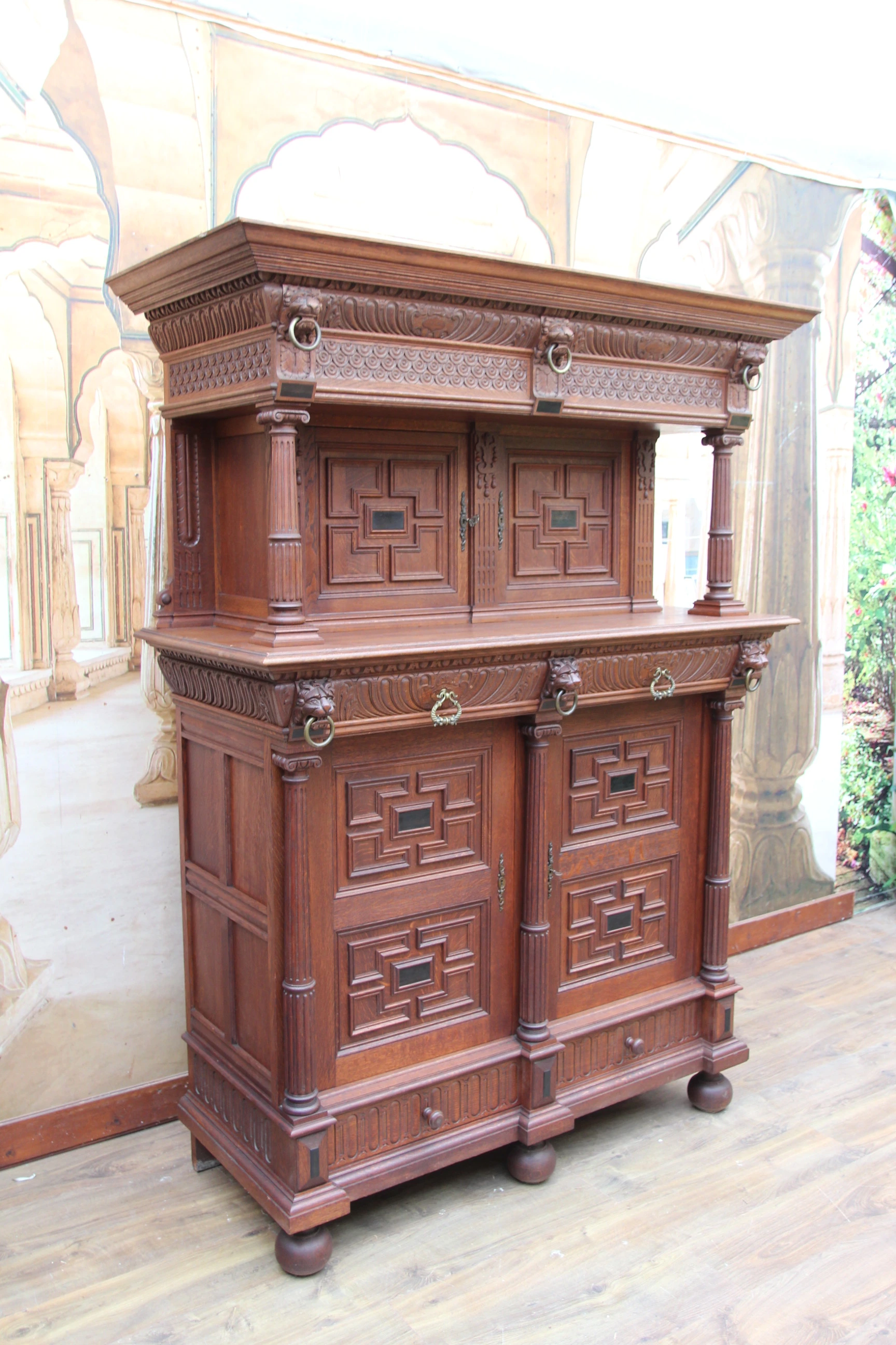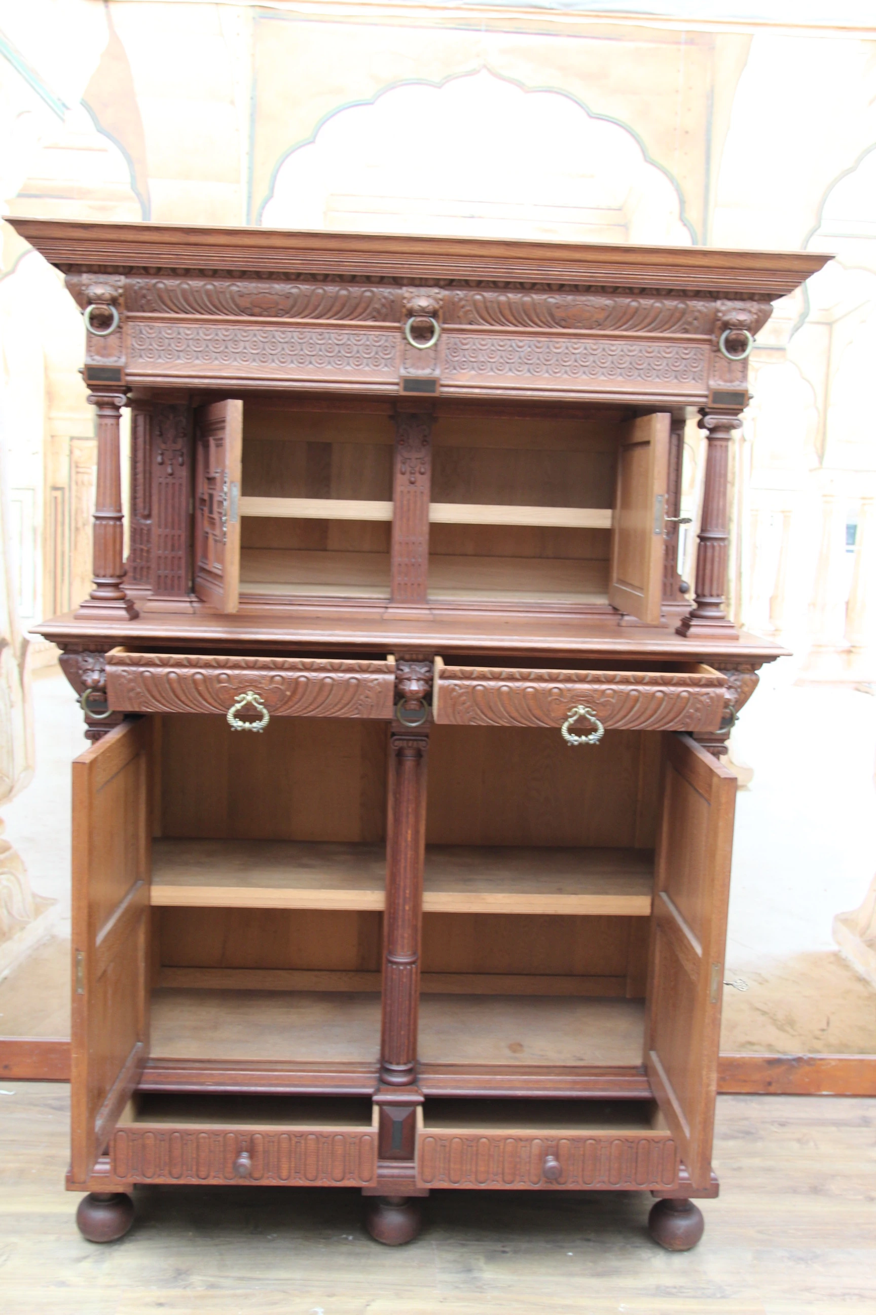 Gefertigt aus massivem Eichenholz enthält es außerdem insgesamt 4 Schubfächer und 4 Türen.