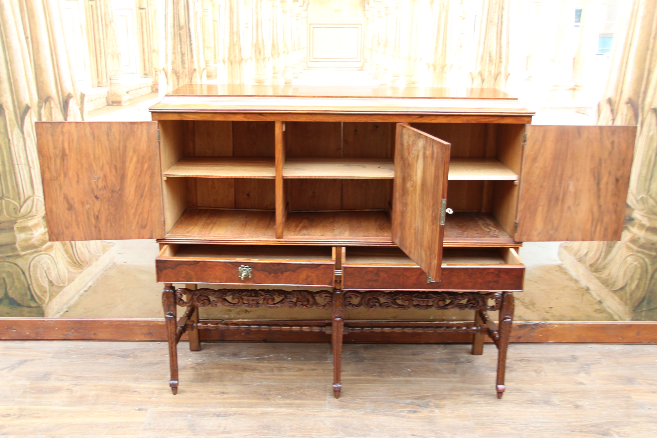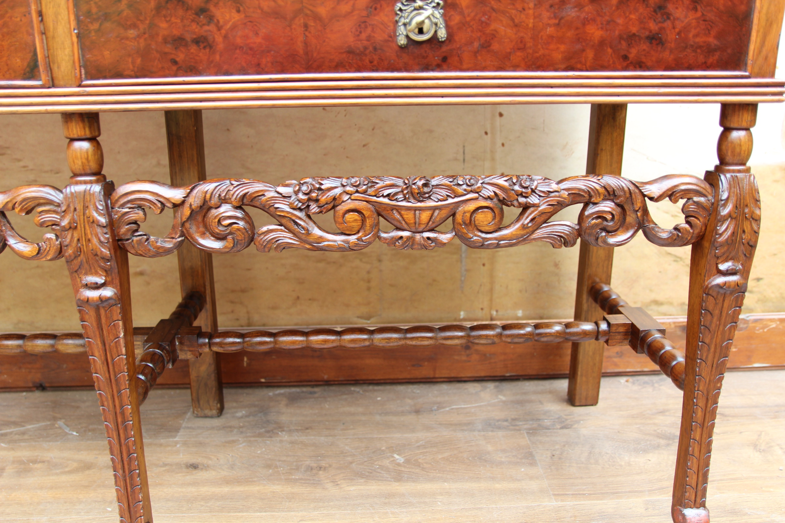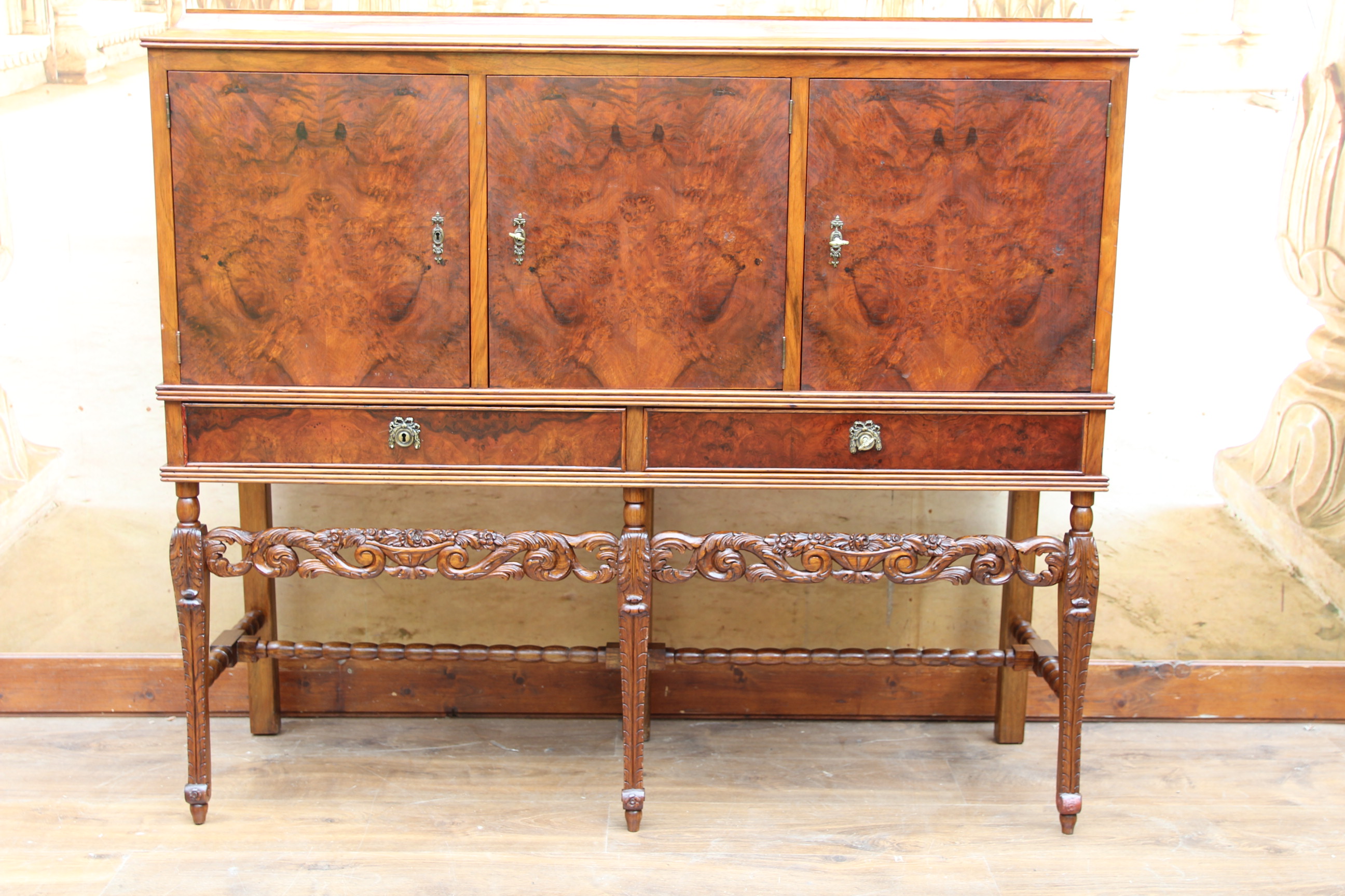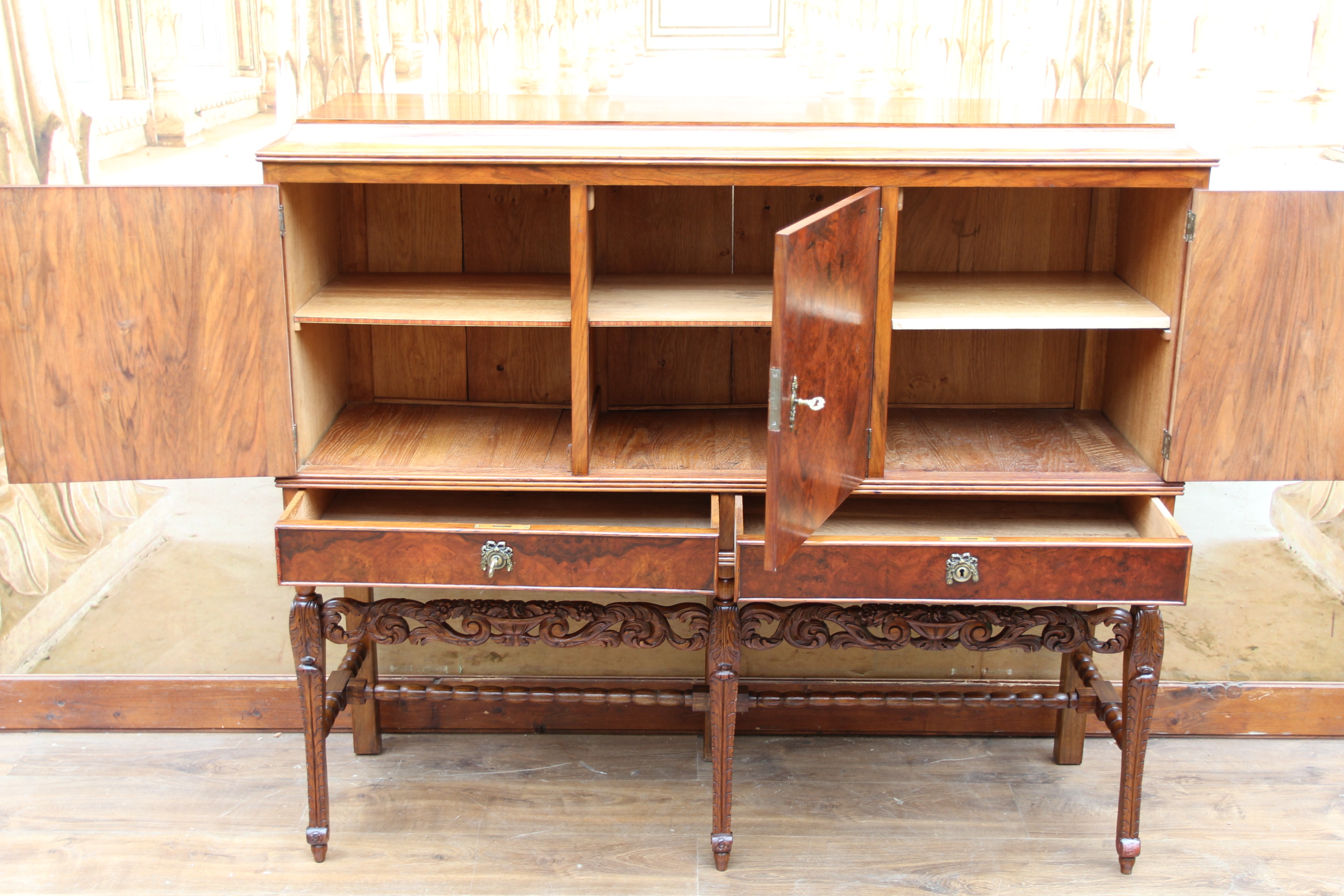Gefertigt aus massivem Eichenholz mit Wurzelholzfurnier enthält es außerdem 3 Türen und 2 Schubfächer.