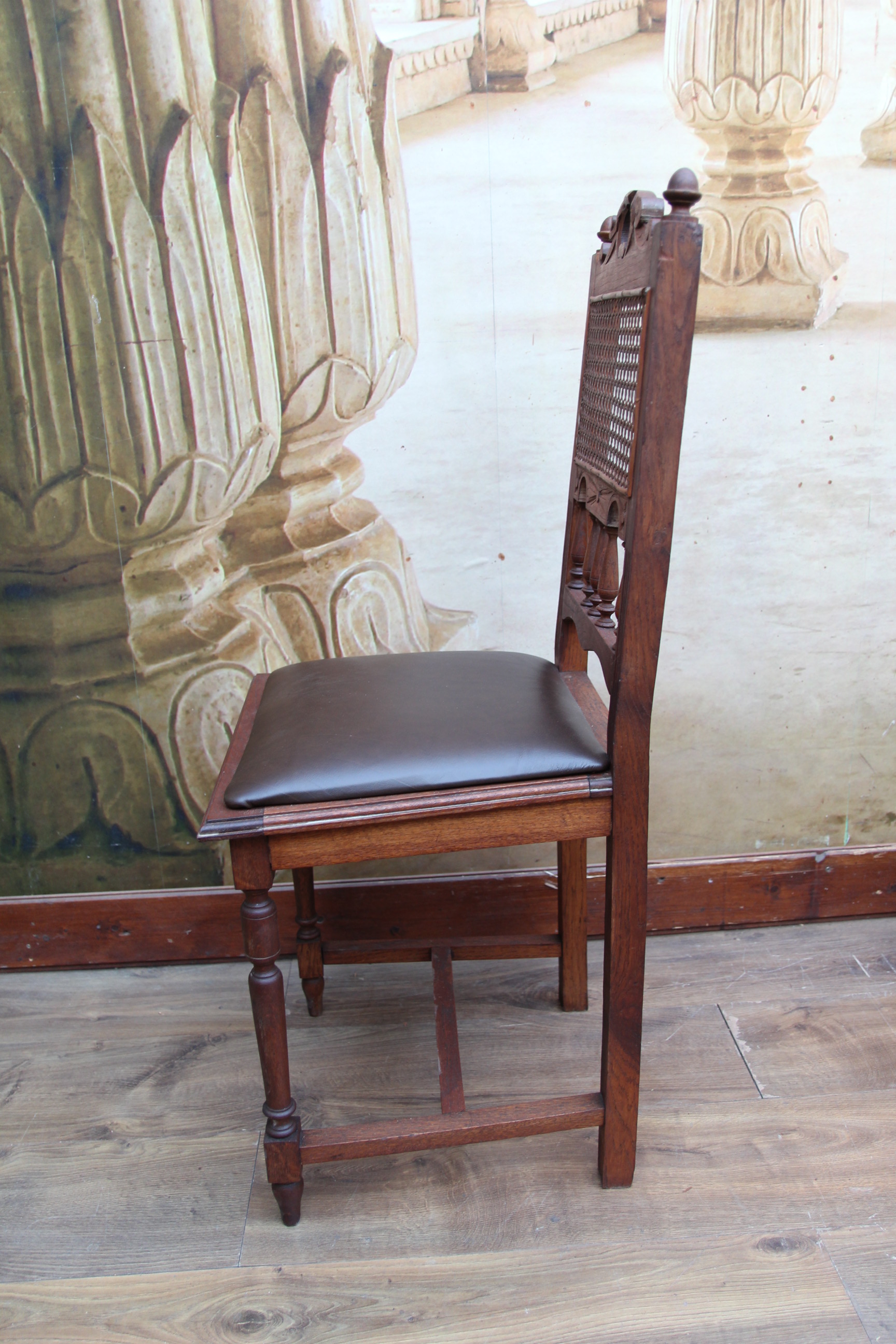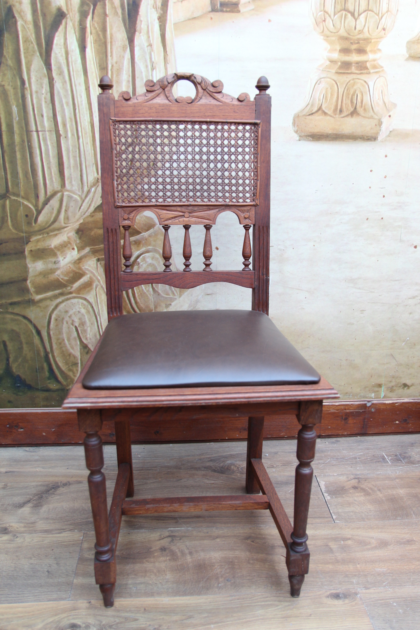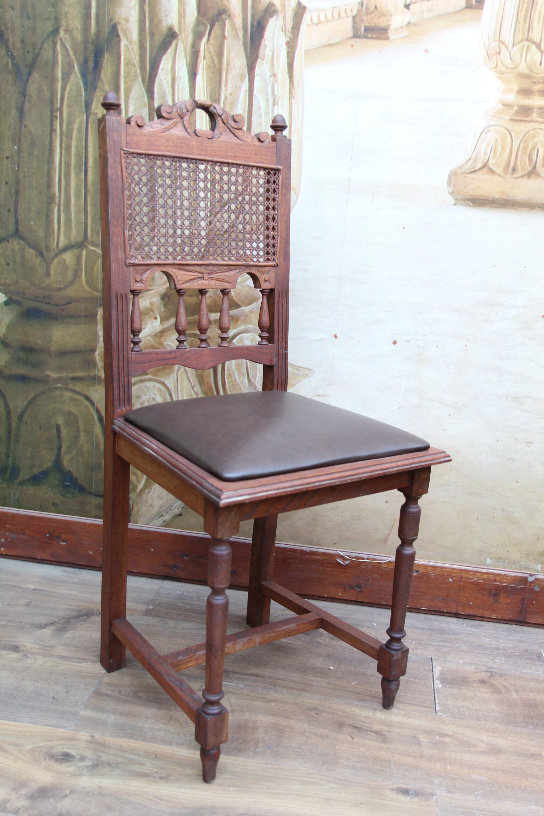 Besonders auffällig sind die wunderschönen Schnitzereien. Die Sitzfläche ist mit Echtleder. Sie wurde schon mal erneuert.