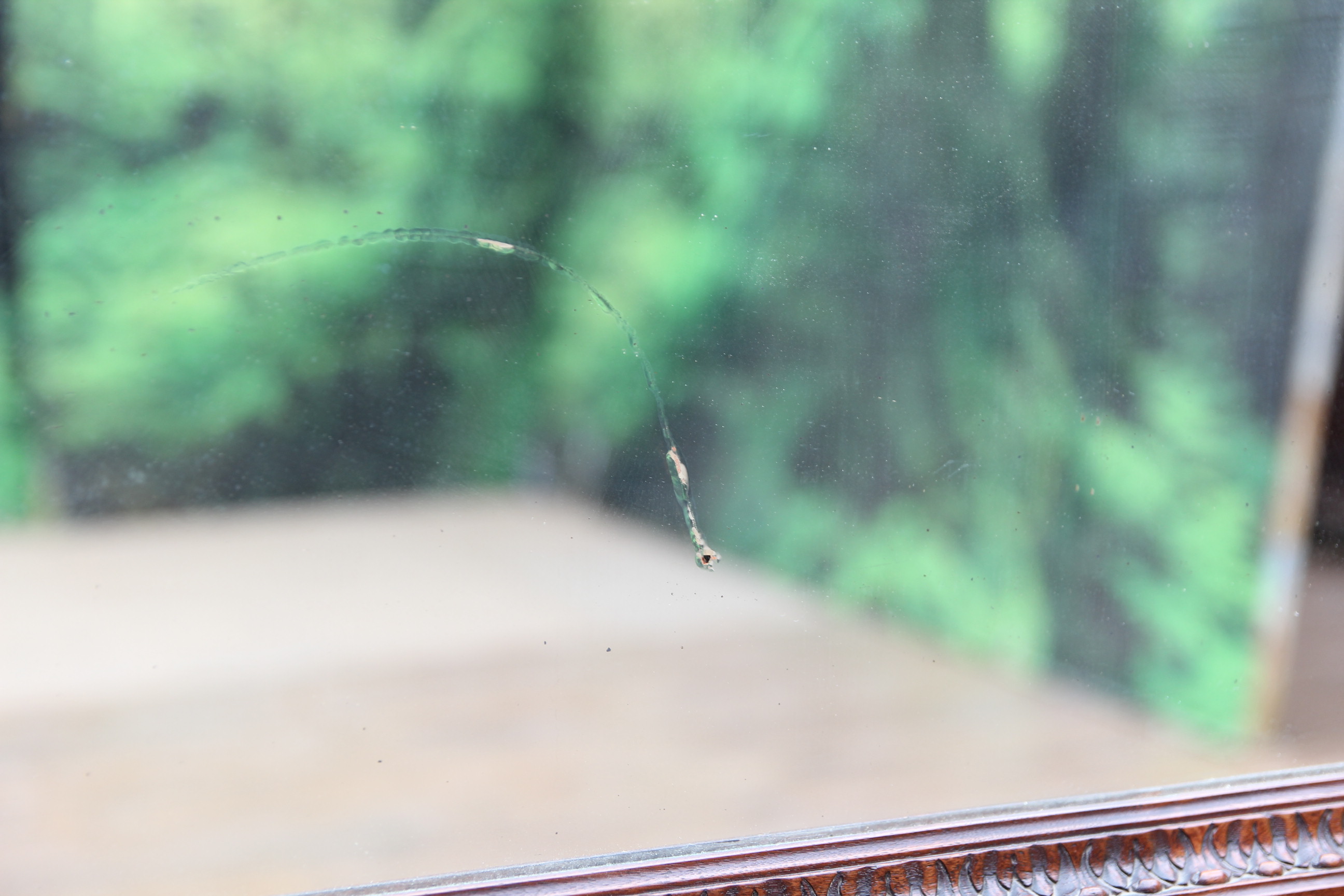 Der Spiegel hatte mal minimal altersbedingt den Holzwurm zu Gast, der erfolgreich in einem Heißluftverfahren ohne Chemikalien behandelt wurde und nicht mehr vorhanden ist. Der Spiegel hat Kratzer siehe Bild.