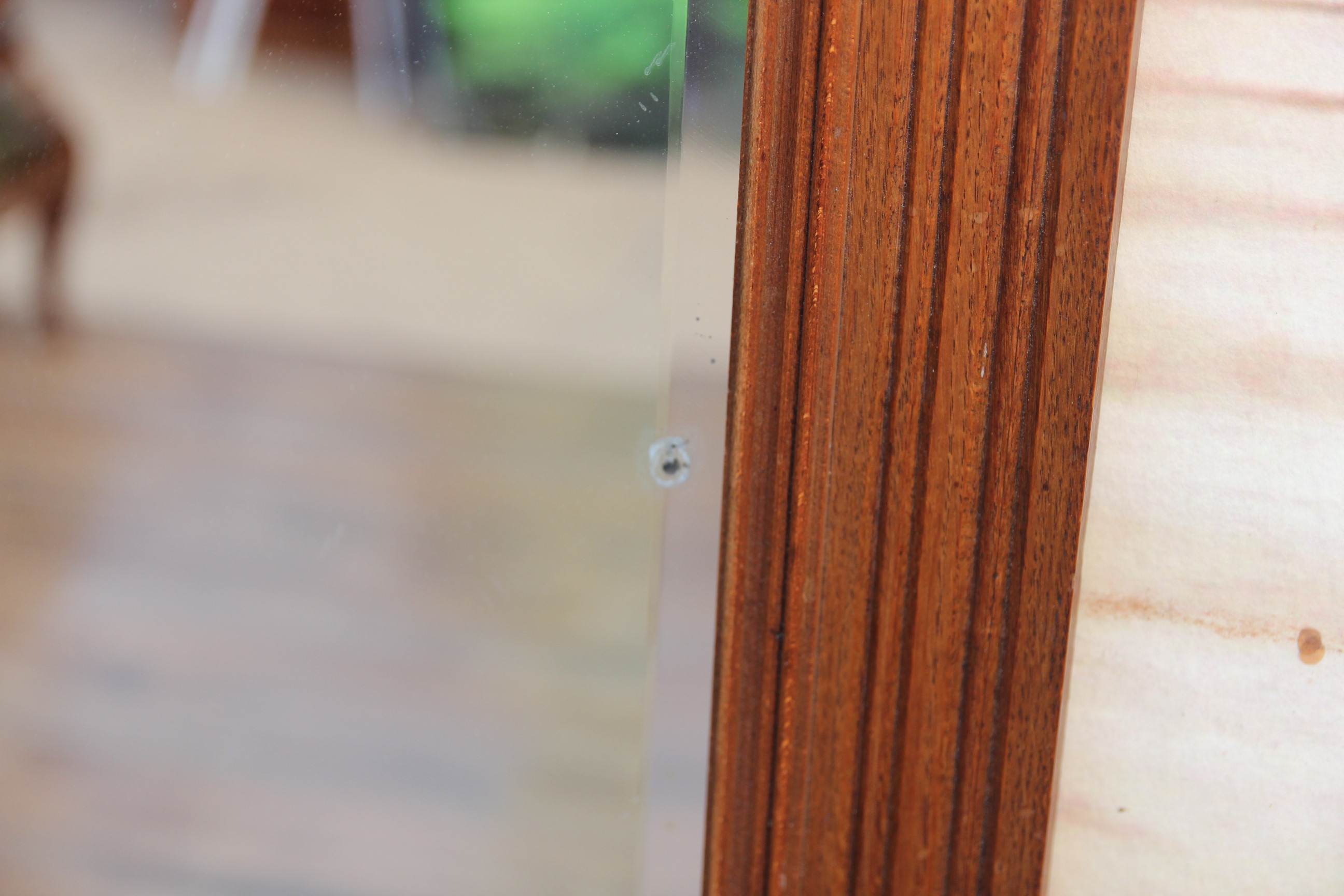 Der Spiegel hatte mal minimal altersbedingt den Holzwurm zu Gast, der erfolgreich in einem Heißluftverfahren ohne Chemikalien behandelt wurde und nicht mehr vorhanden ist. Der Spiegel hat Altersflecken siehe Bild.